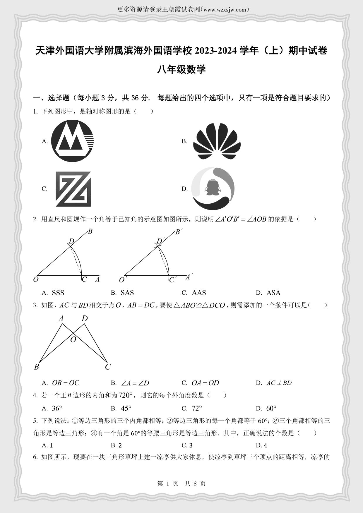 天津外国语大学附属滨海外国语学校2023-2024学年第一学期期中试题八年级数学(人教版)