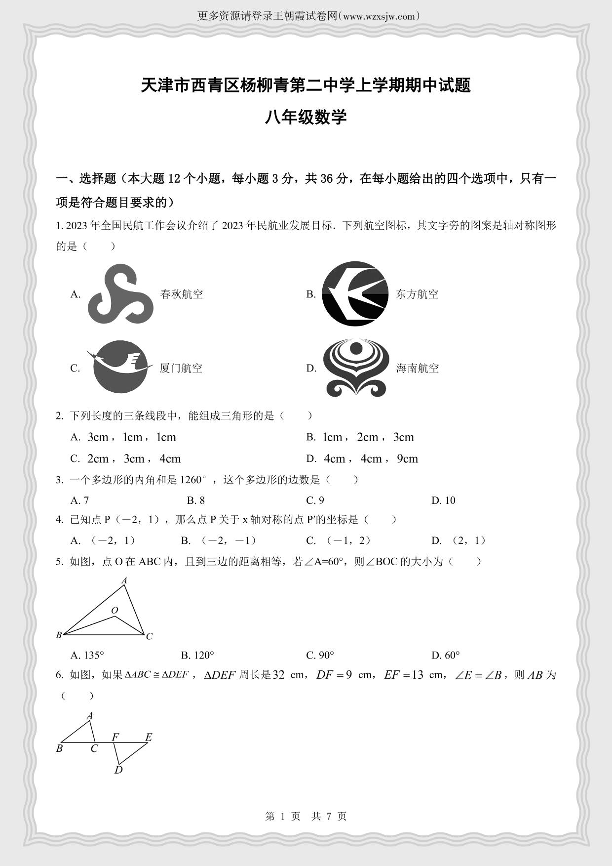 天津市西青区杨柳青第二中学2023-2024学年第一学期期中试题八年级数学(人教版)
