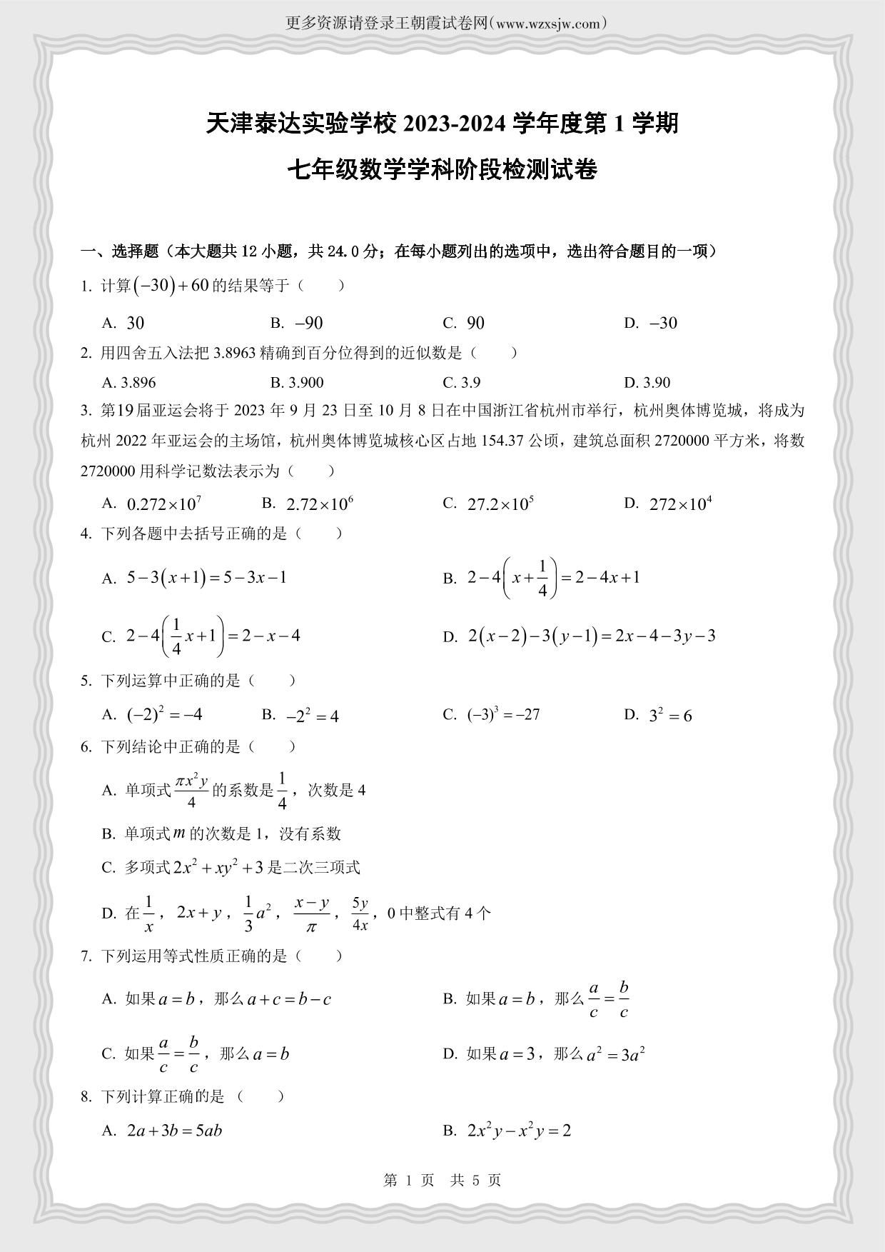天津泰达实验学校2023-2024学年度第一学期学科阶段检测测试卷七年级数学(人教版)