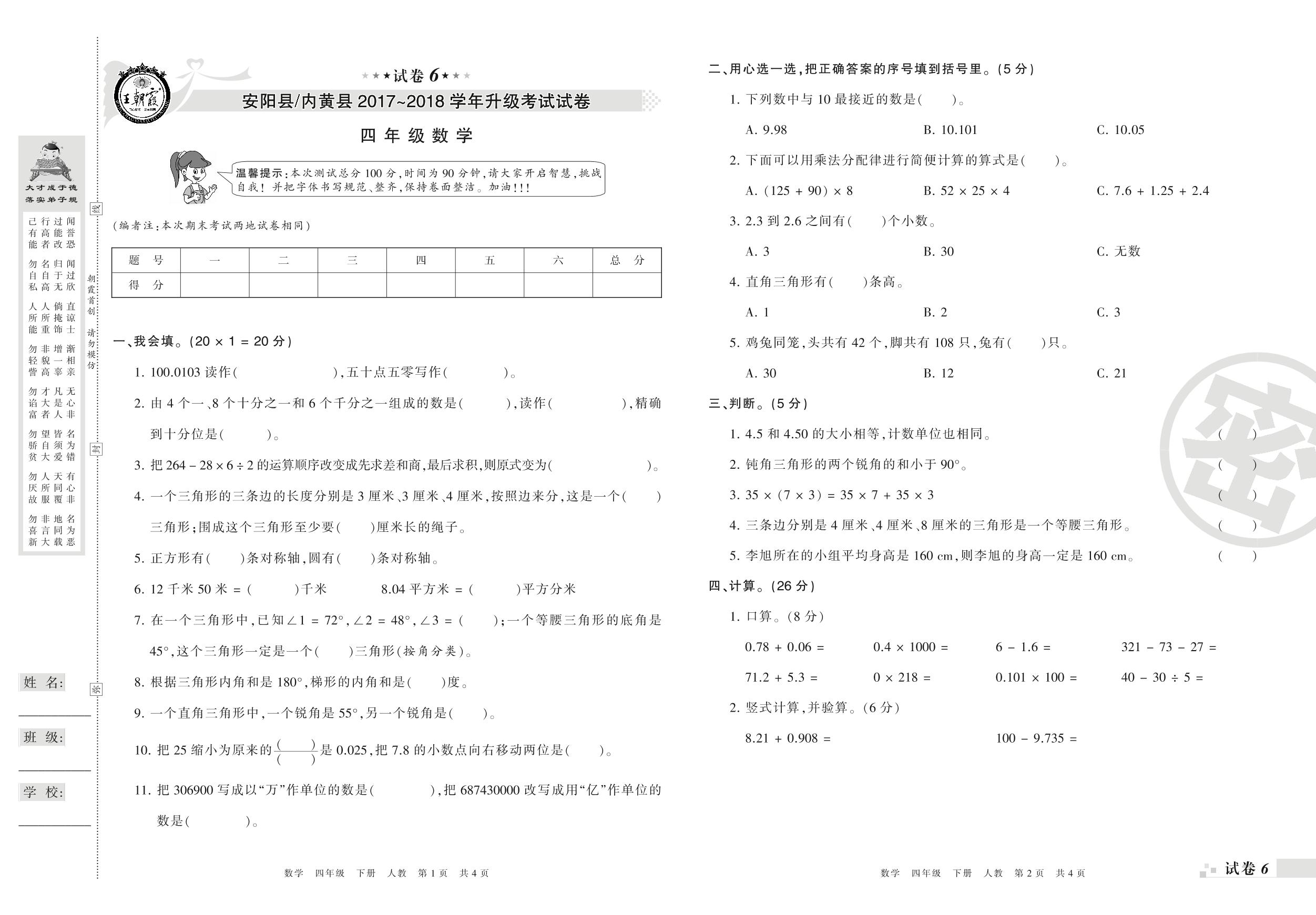 2017-2018学年第二学期安阳市安阳县、内黄县四年级数学试卷(人教版)【6】