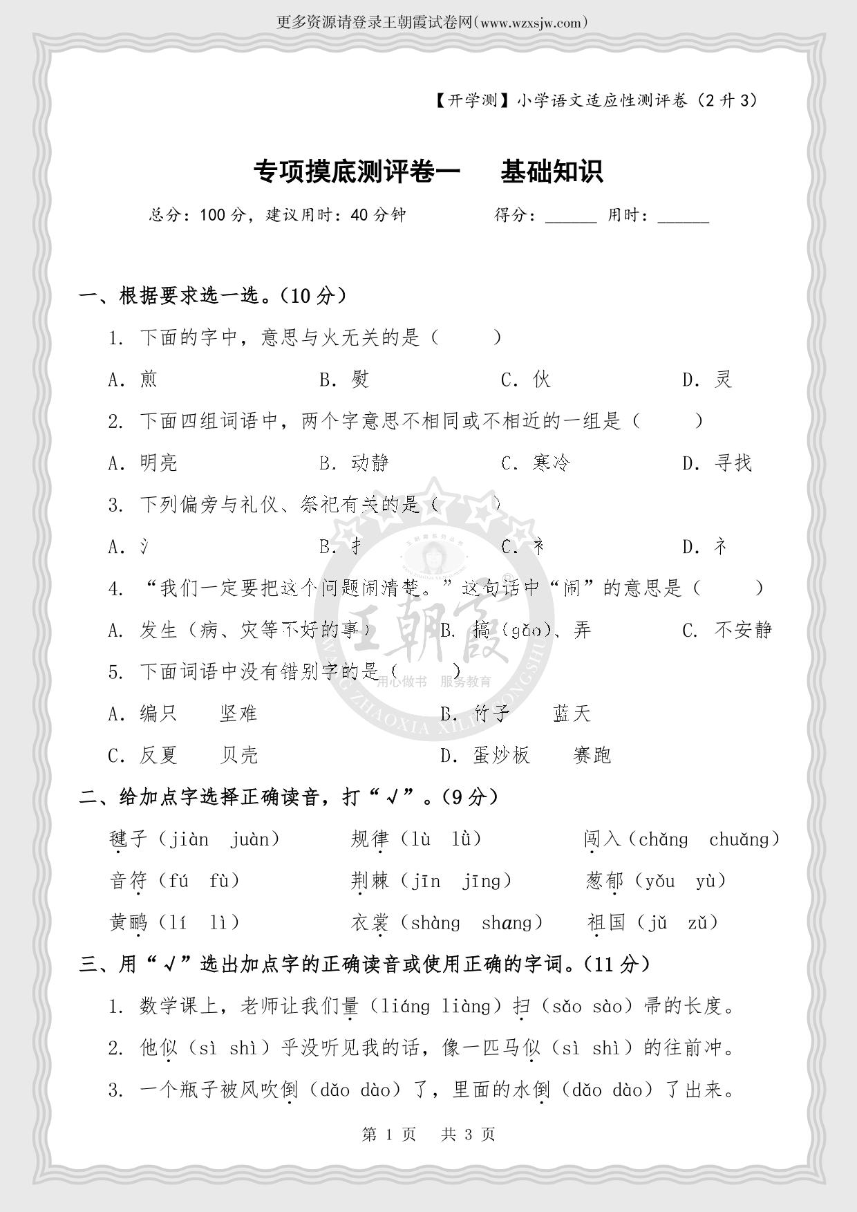 【开学测】小学语文适应性专项摸底测评卷一 基础知识(二升三·人教版)