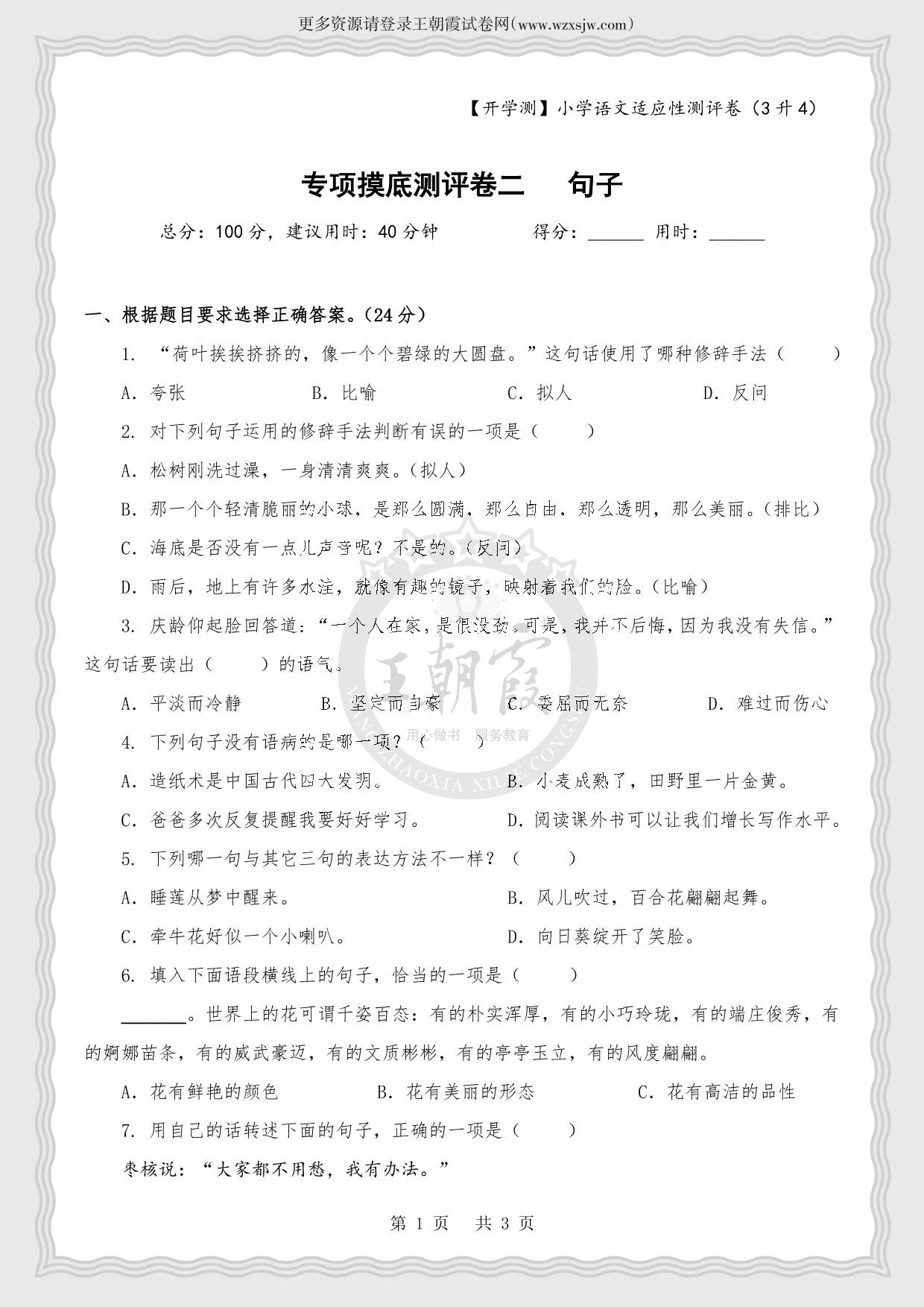 【开学测】小学语文适应性专项摸底测评卷二 句子(三升四·人教版)
