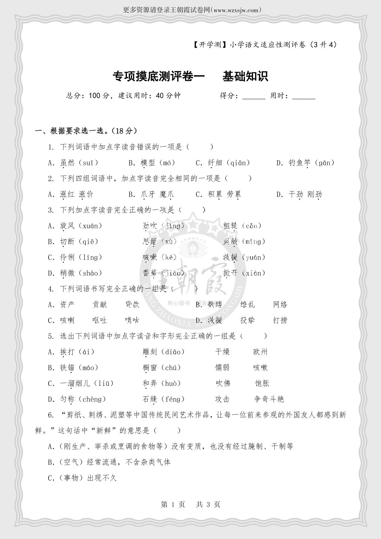 【开学测】小学语文适应性专项摸底测评卷一 基础知识(三升四·人教版)