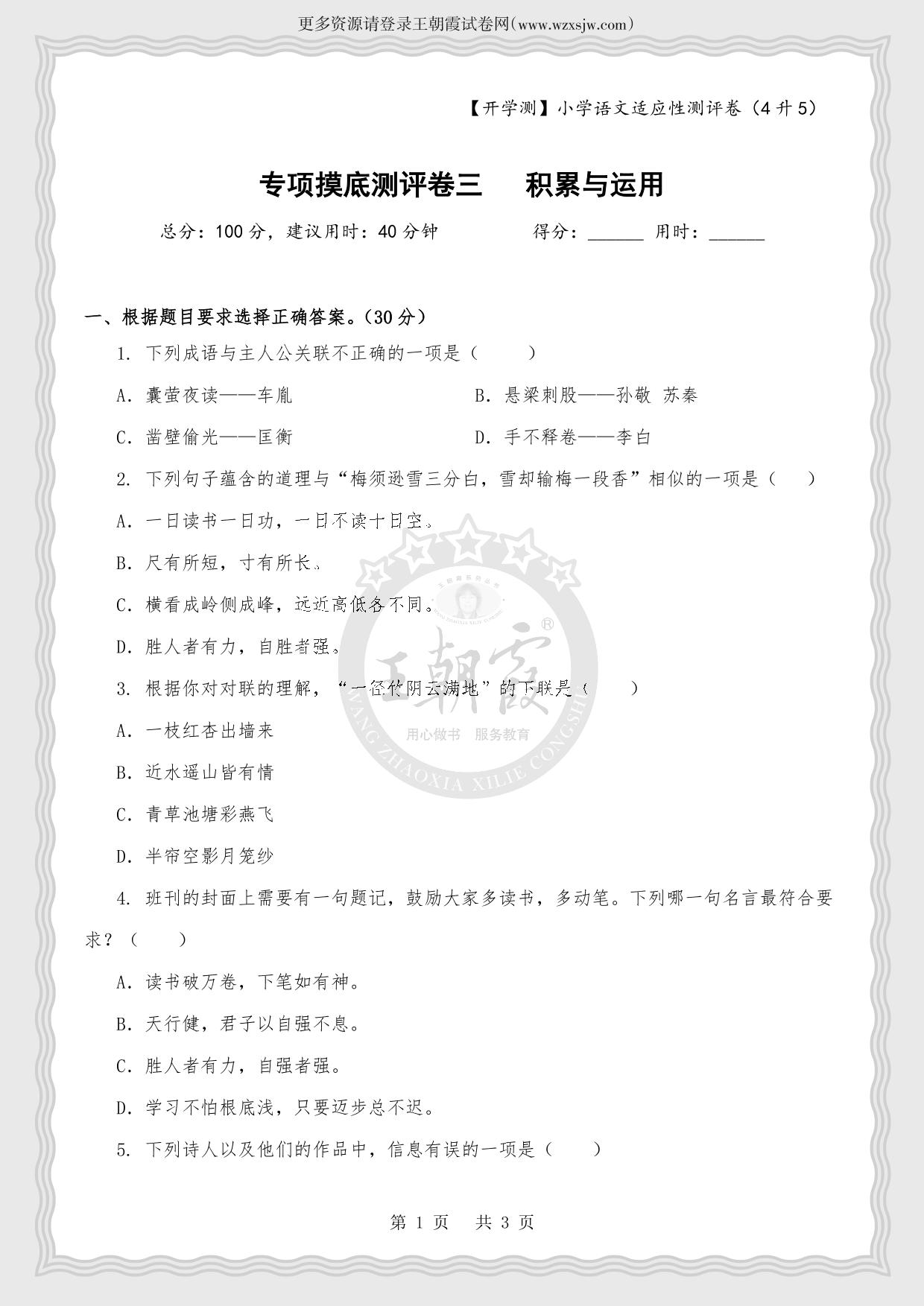 【开学测】小学语文适应性专项摸底测评卷三 积累与运用(四升五·人教版)