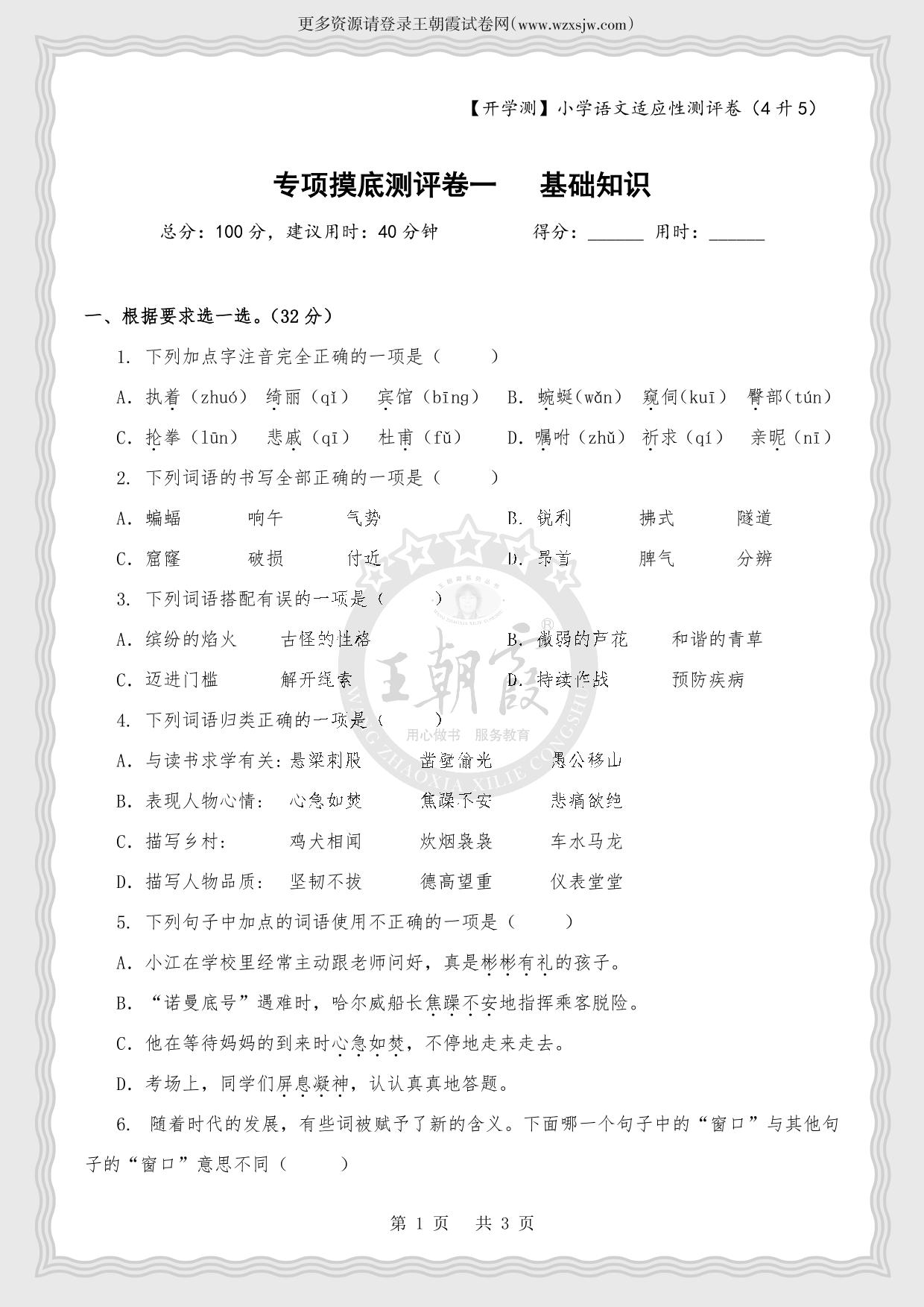 【开学测】小学语文适应性专项摸底测评卷一 基础知识(四升五·人教版)