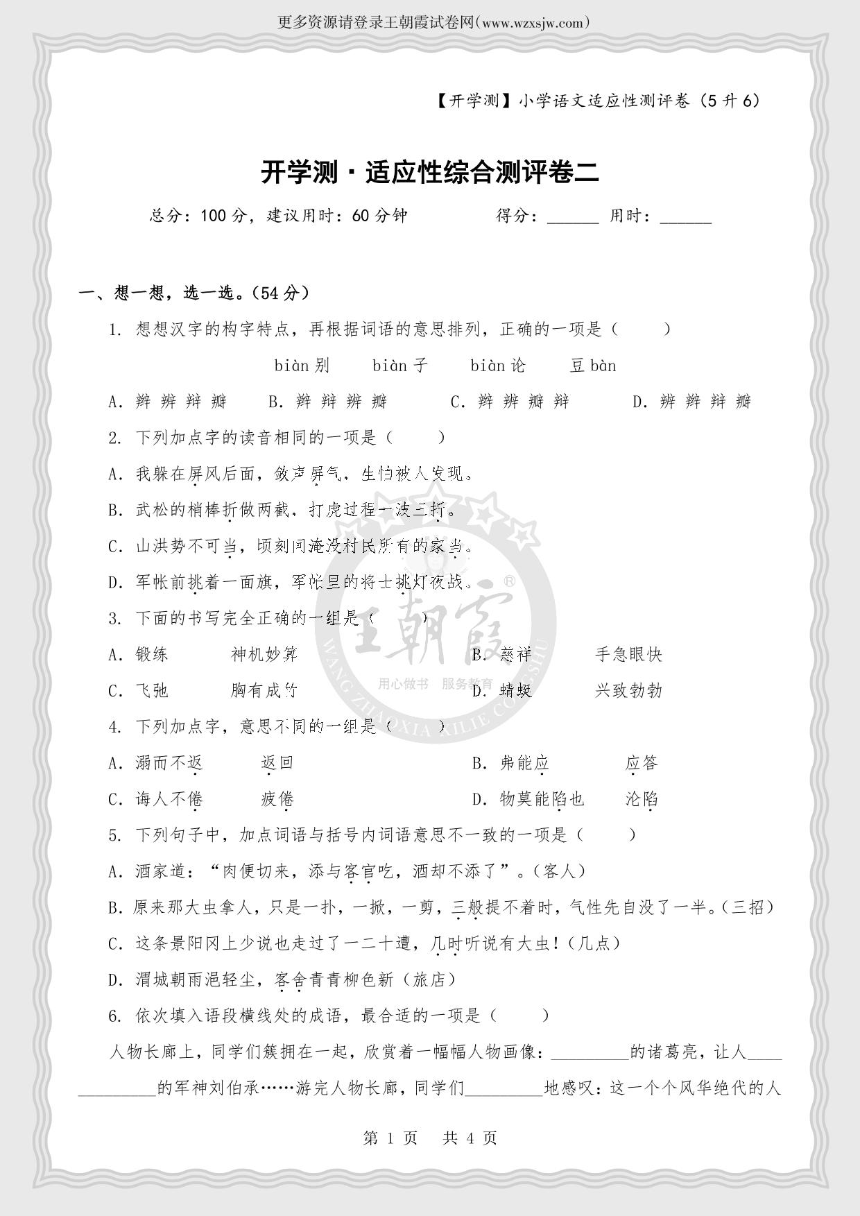 【开学测】小学语文适应性综合测评卷二(五升六·人教版)