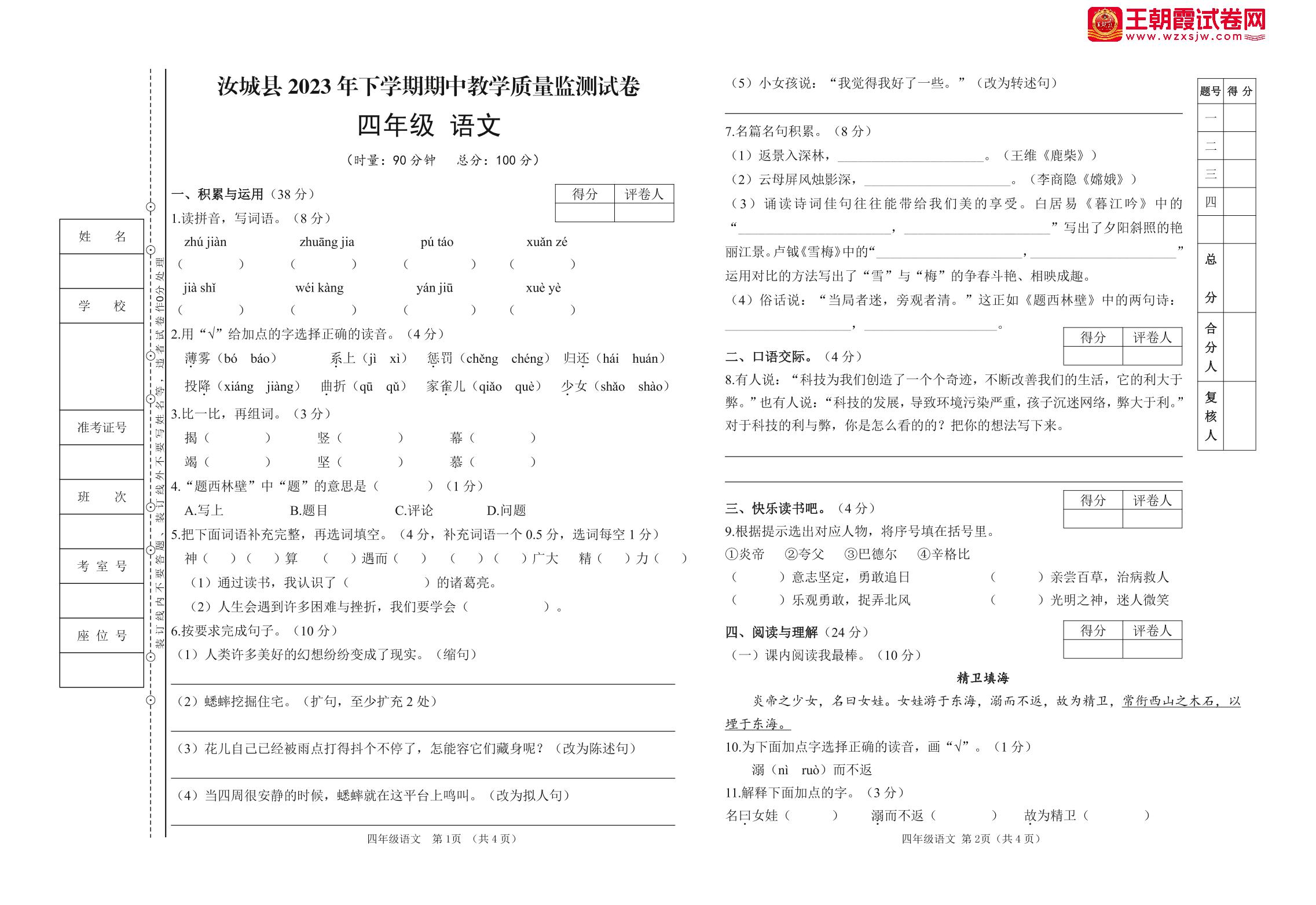 湖南省郴州市汝城县2023-2024学年第一学期期中教学质量监测试卷四年级语文(人教版)