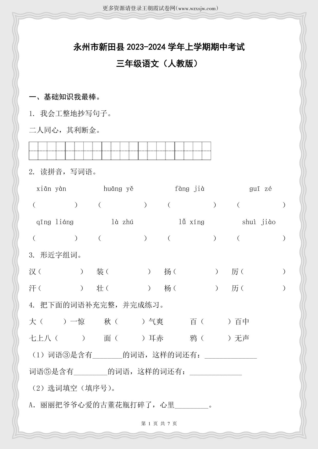 湖南省永州市新田县2023-2024学年上学期期中考试三年级语文(人教版)