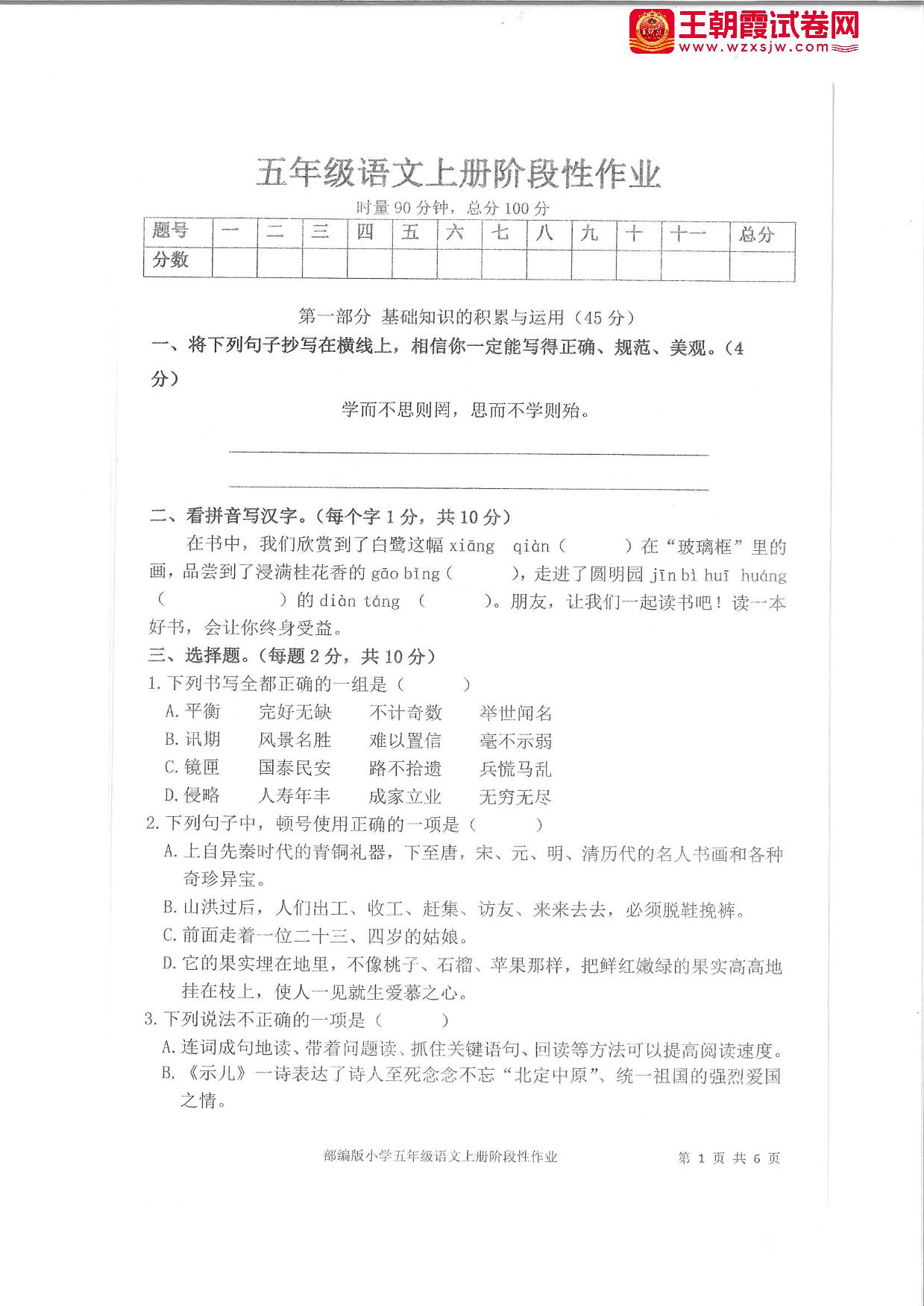 湖南省邵阳市隆回县2023-2024学年上学期期中阶段性作业五年级语文(人教版)