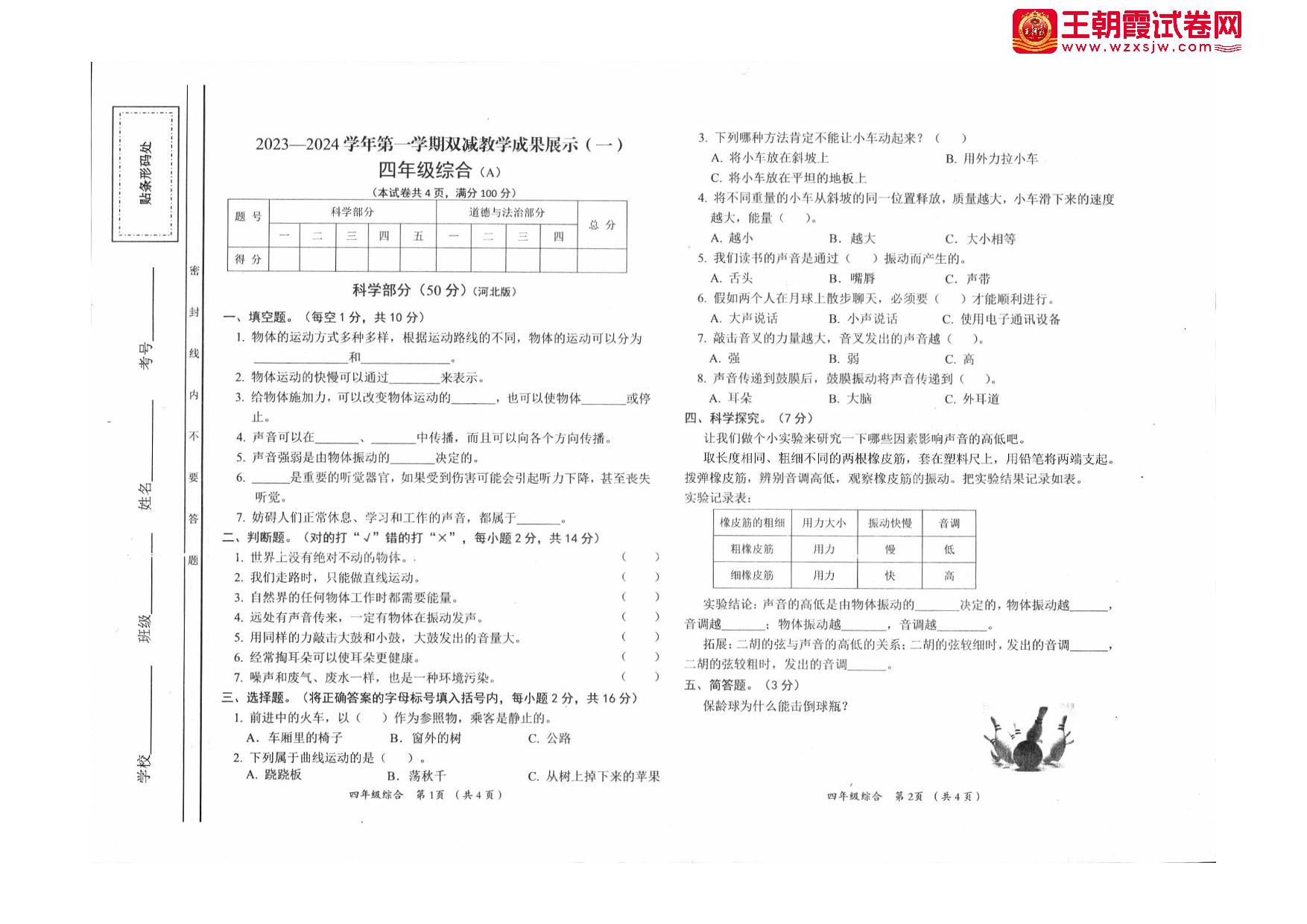 山西省忻州市2023-2024学年第一学期双减效果展示(期中)四年级科学、道德与法治综合试卷