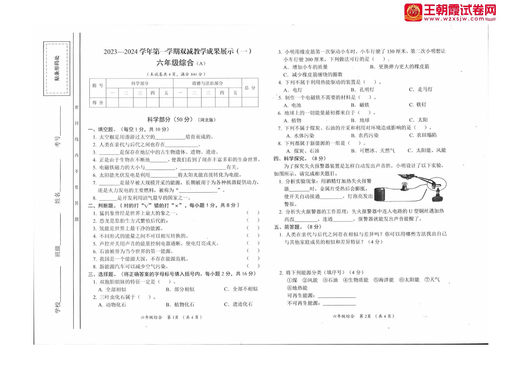 山西省忻州市2023-2024学年第一学期双减效果展示(期中)六年级科学、道德与法治综合试卷