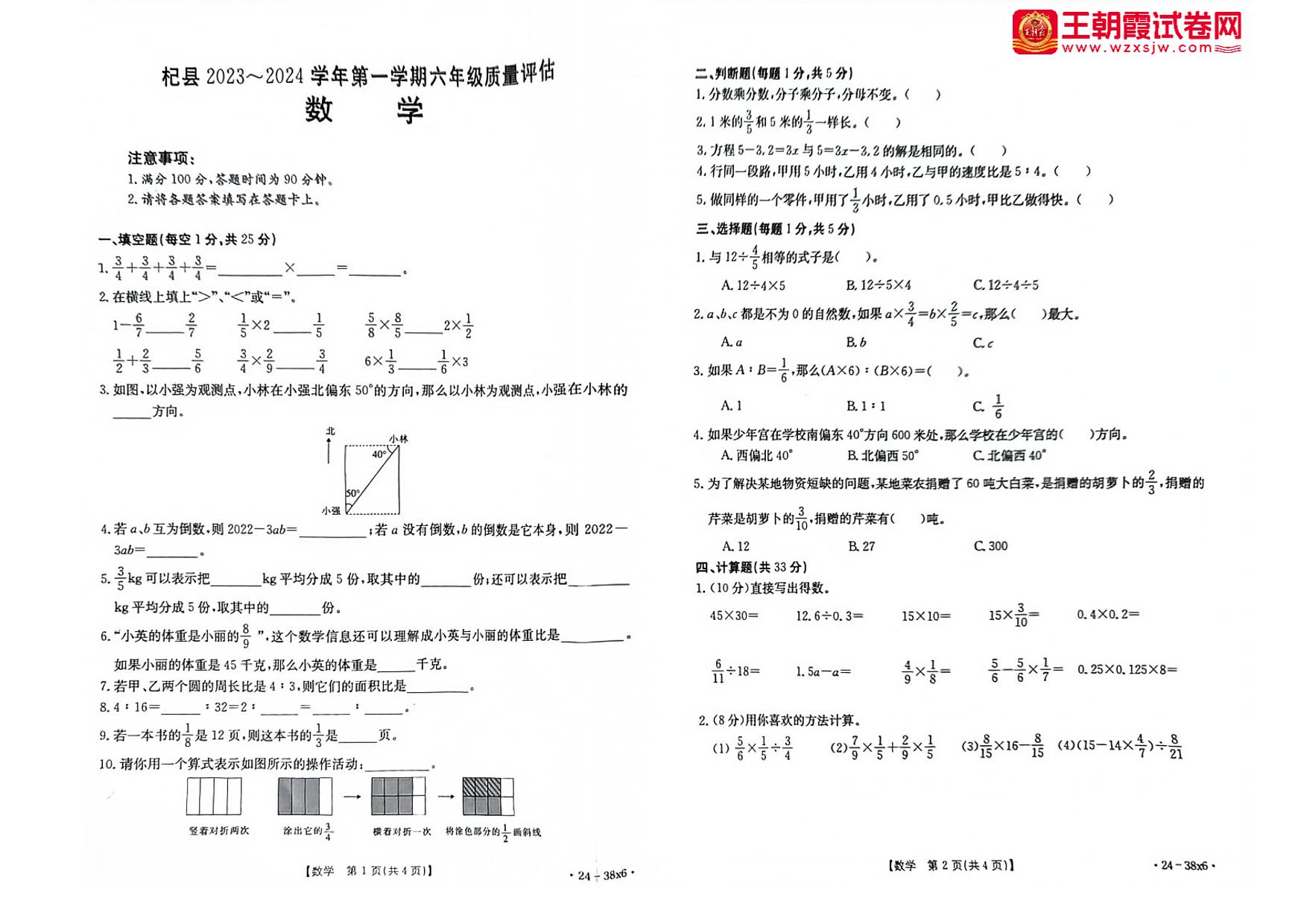 河南省开封市杞县2023-2024学年第一学期期中质量试卷评估六年级数学(人教版)