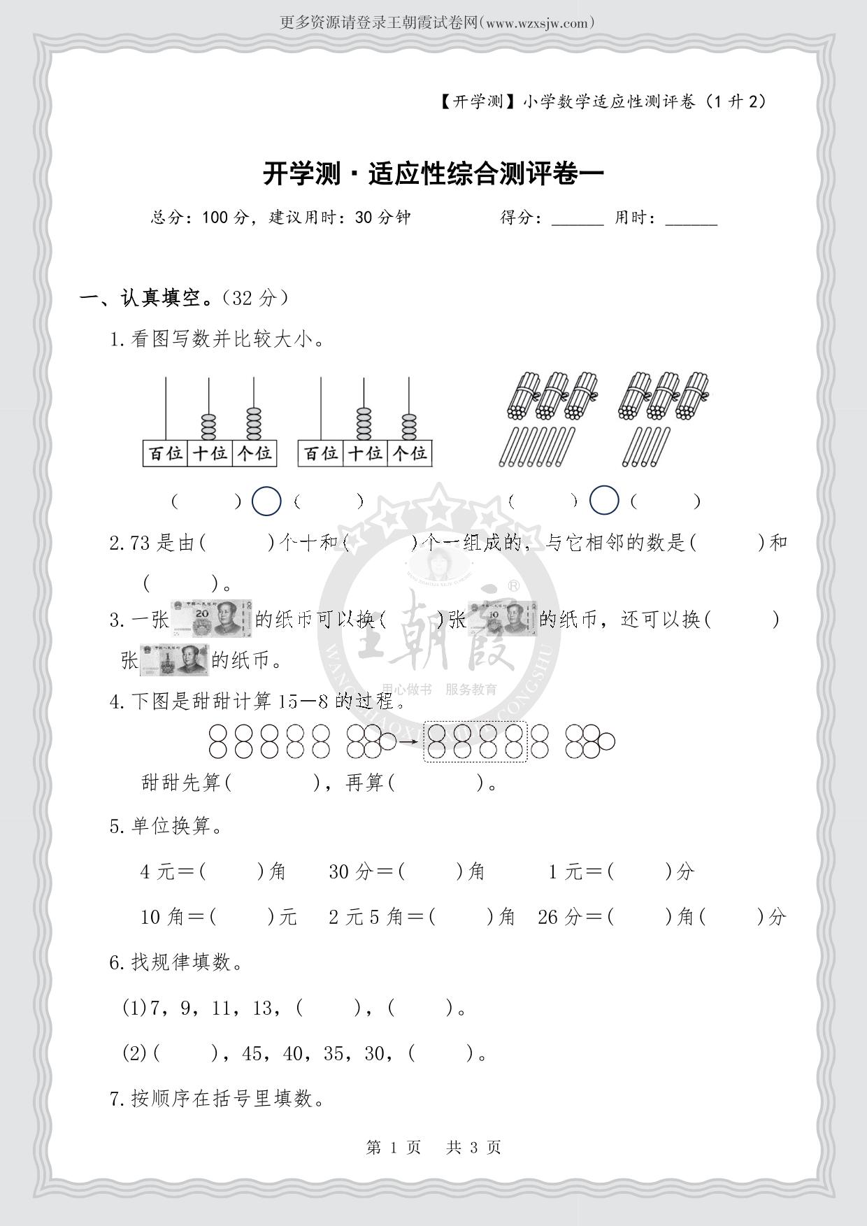 【开学测】小学数学适应性综合测评卷一 (1升2·人教版)