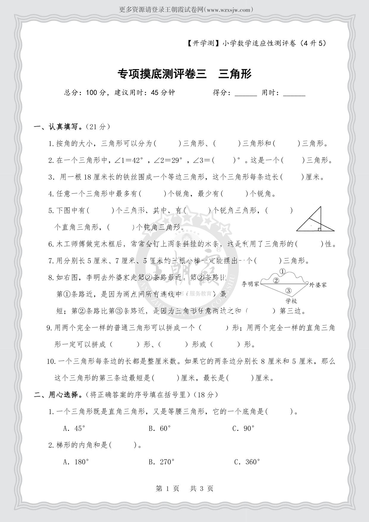 【开学测】小学数学适应性专项摸底测评卷三 三角形(4升5·人教版)