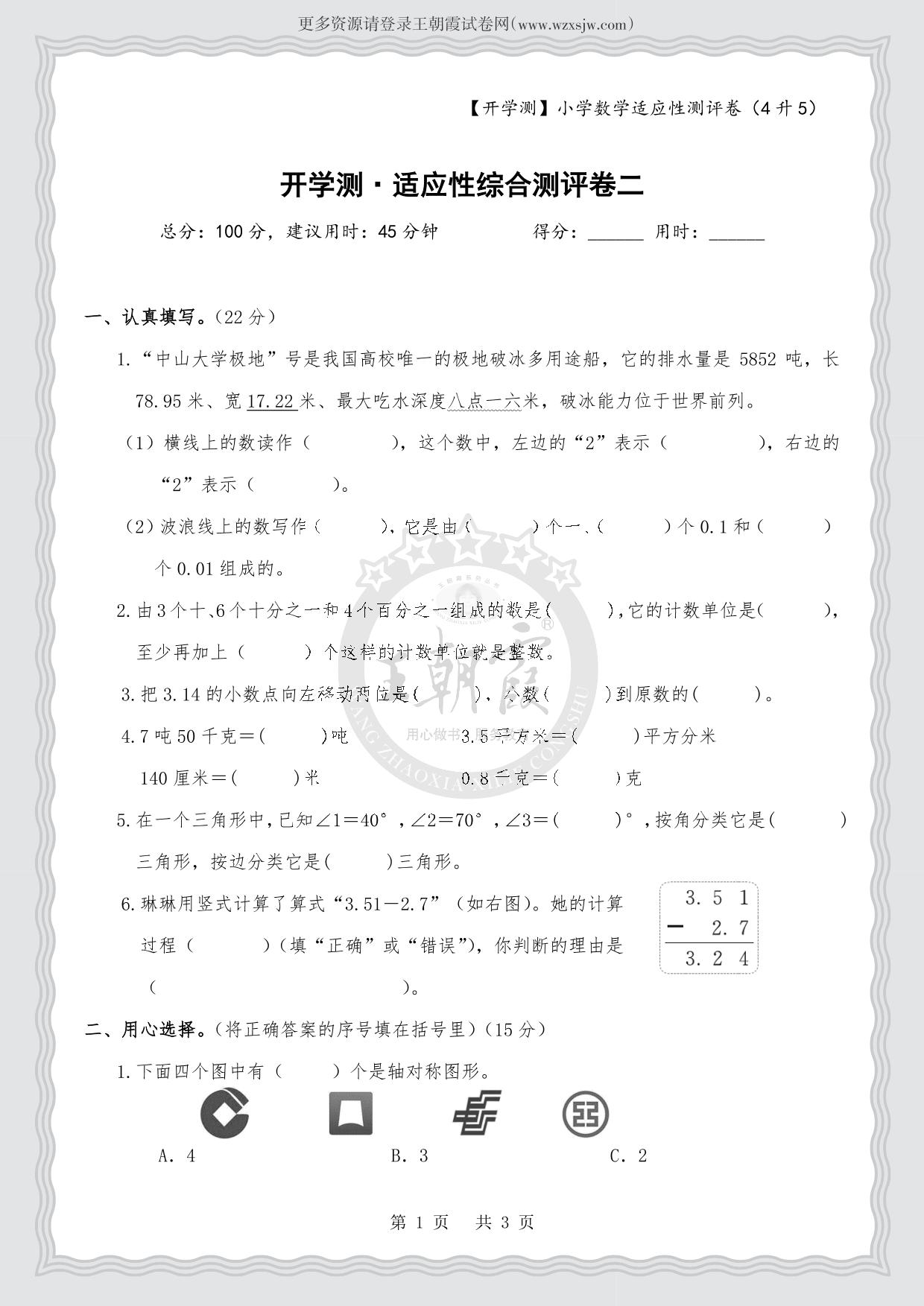 【开学测】小学数学适应性综合测评卷二 (4升5·人教版)