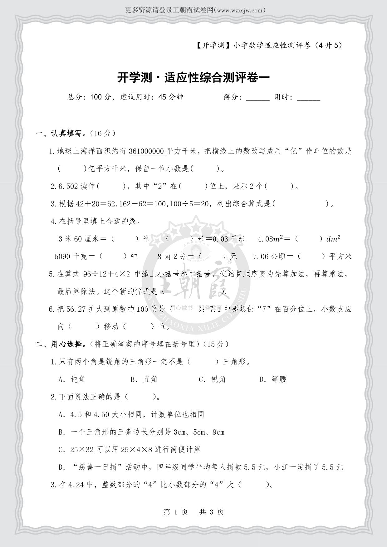 【开学测】小学数学适应性综合测评卷一 (4升5·人教版)