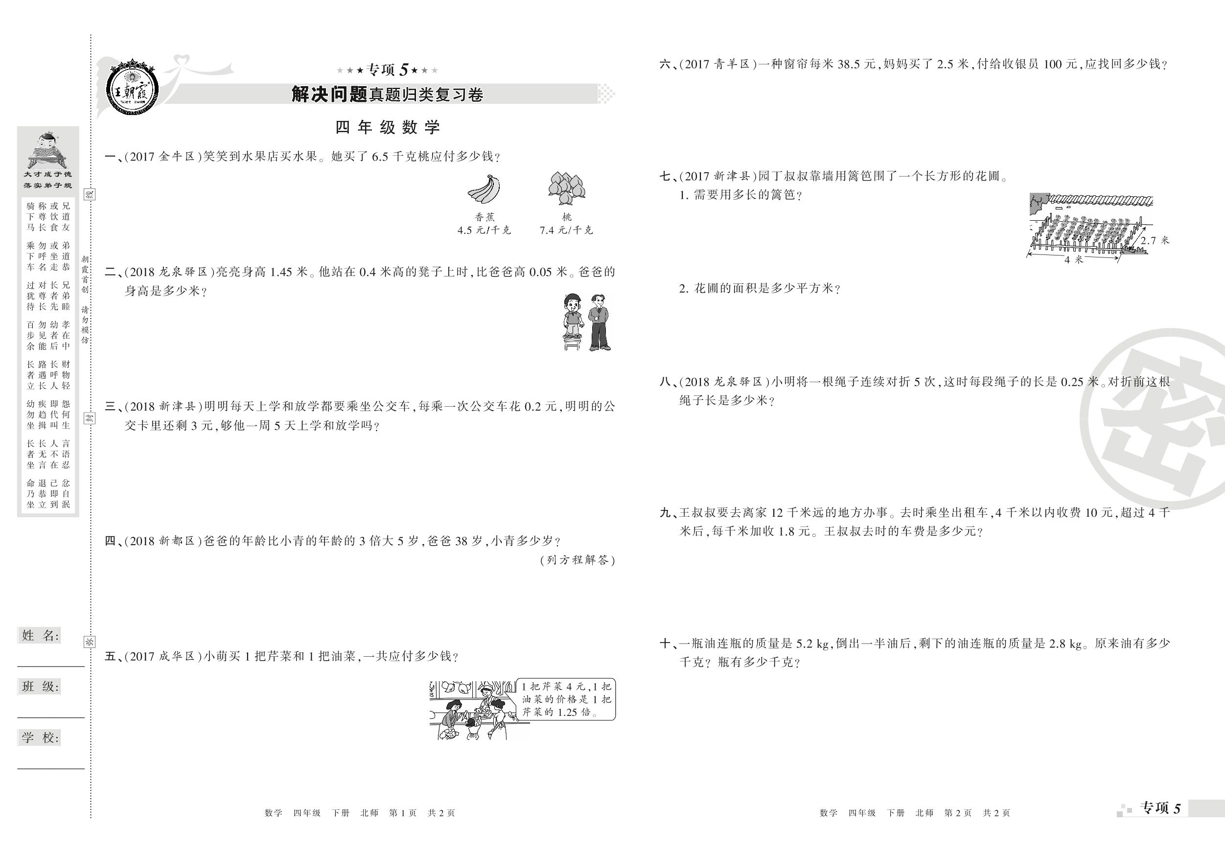 王朝霞期末专项卷——解决问题、能力拔高真题归类复习卷四年级下册数学(北师版)_R210804151524【0】