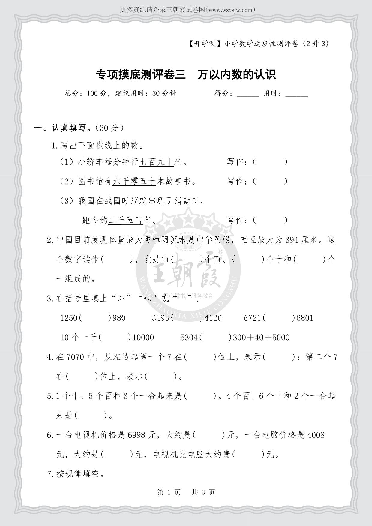 【开学测】小学数学适应性专项摸底测评卷三 万以内数的认识 (2升3·人教版)