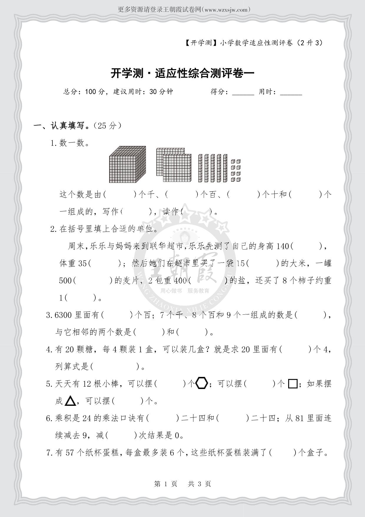 【开学测】小学数学适应性综合测评卷一 (2升3·人教版)
