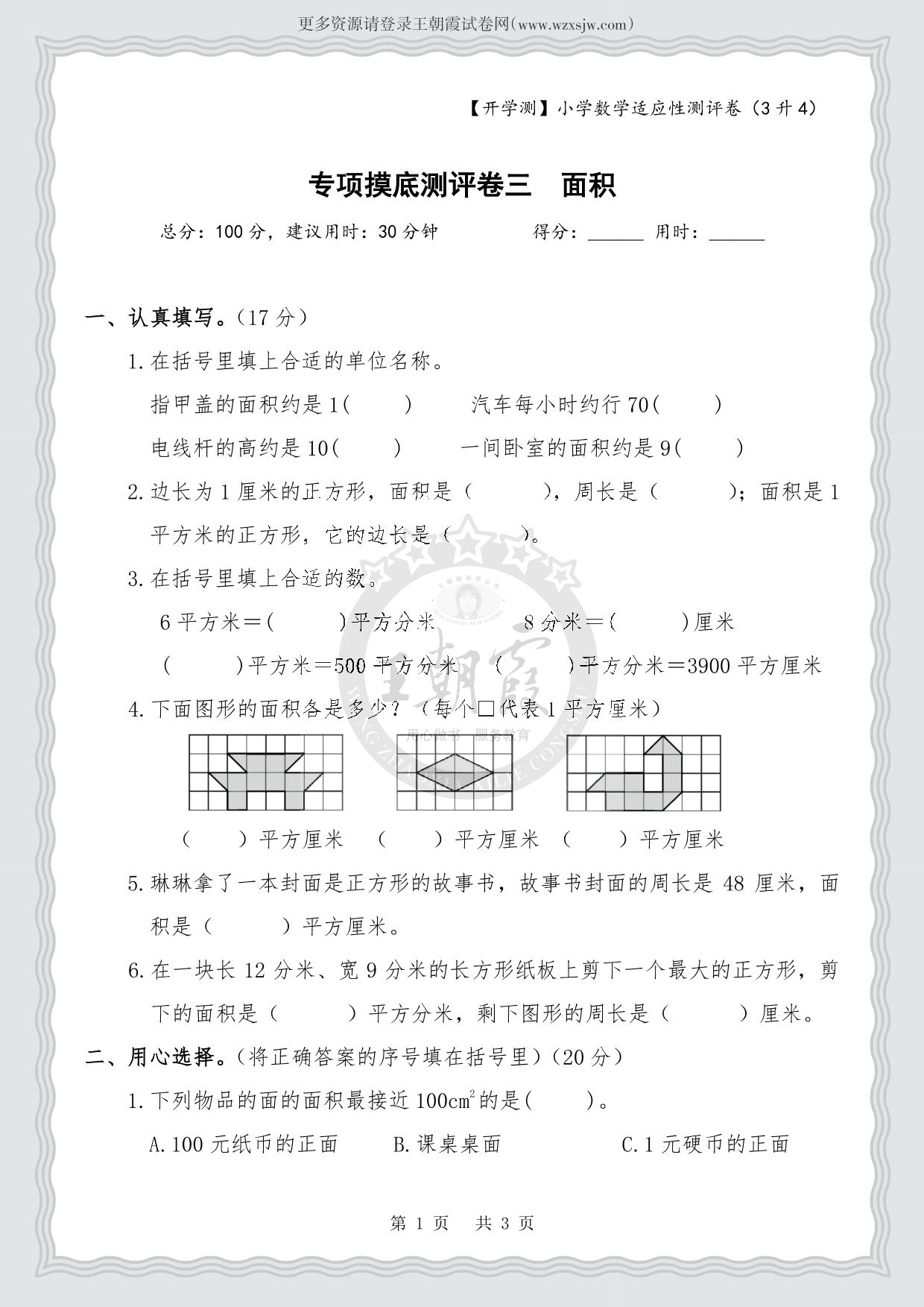 【开学测】小学数学适应性专项摸底测评卷三 面积(3升4·人教版)