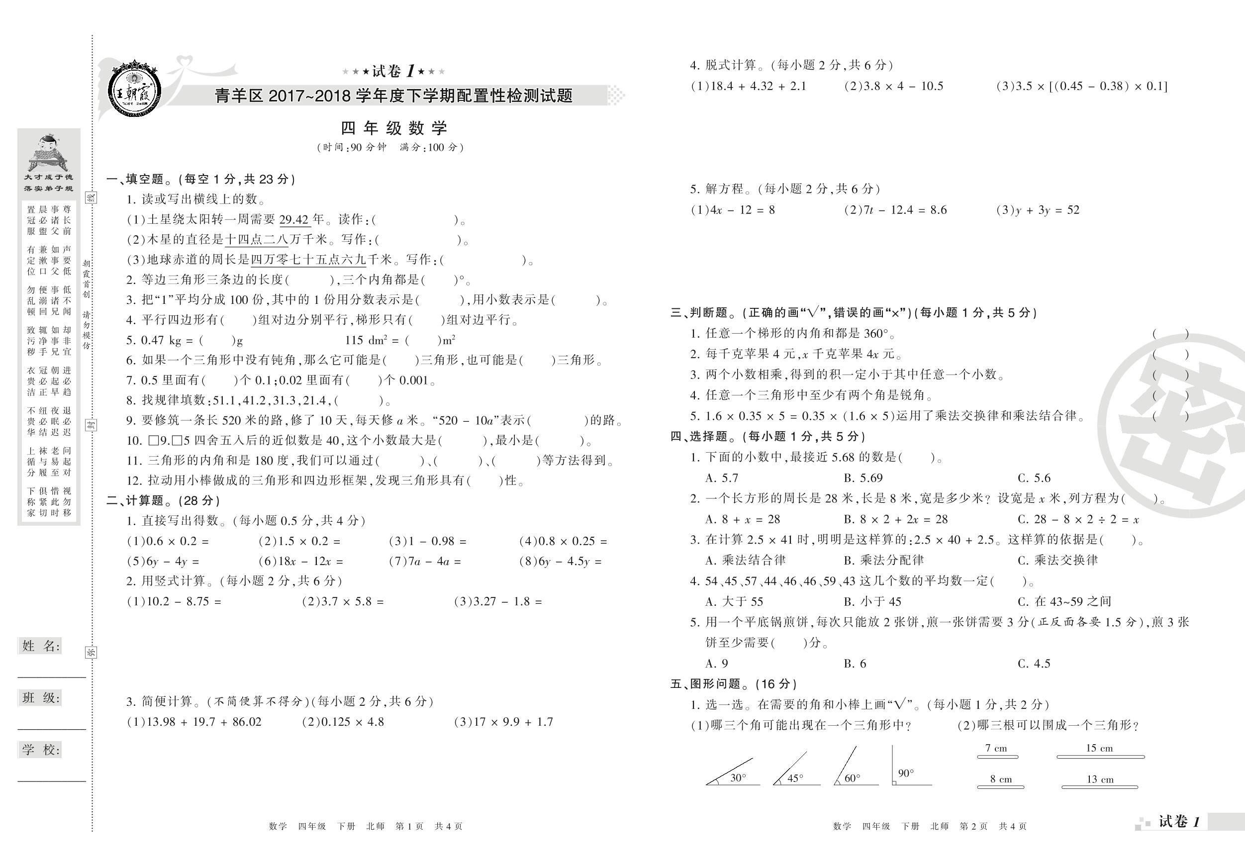 2017-2018学年第二学期成都市青羊区四年级数学试卷(北师版)【1】