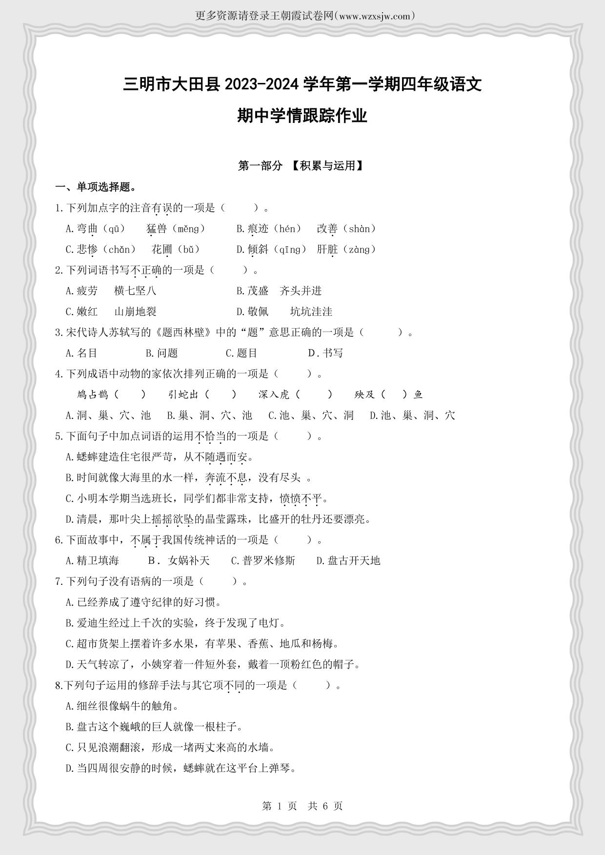 福建省三明市大田县2023-2024学年第一学期期中学情跟踪作业四年级语文(人教版)