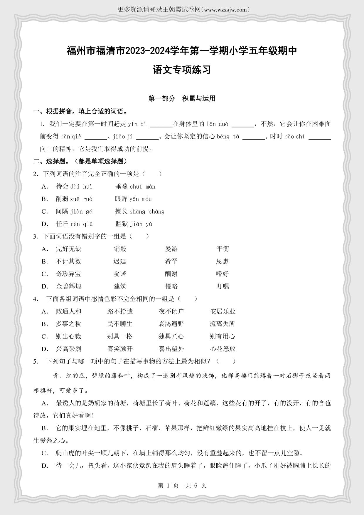 福建省福州市福清市2023-2024学年第一学期期中专项练习试题五年级语文(人教版)