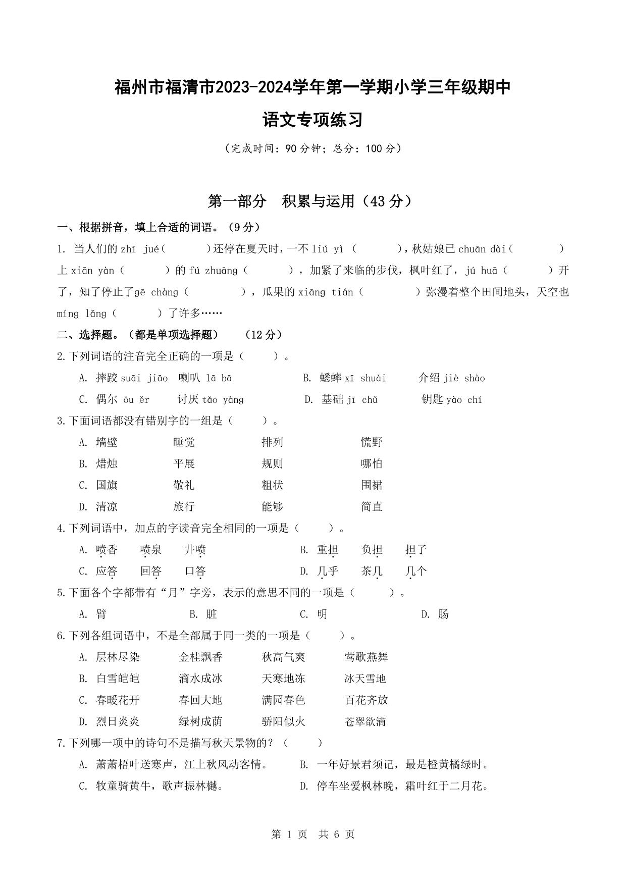 福建省福州市福清市2023-2024学年第一学期期中专项练习试题三年级语文(人教版)