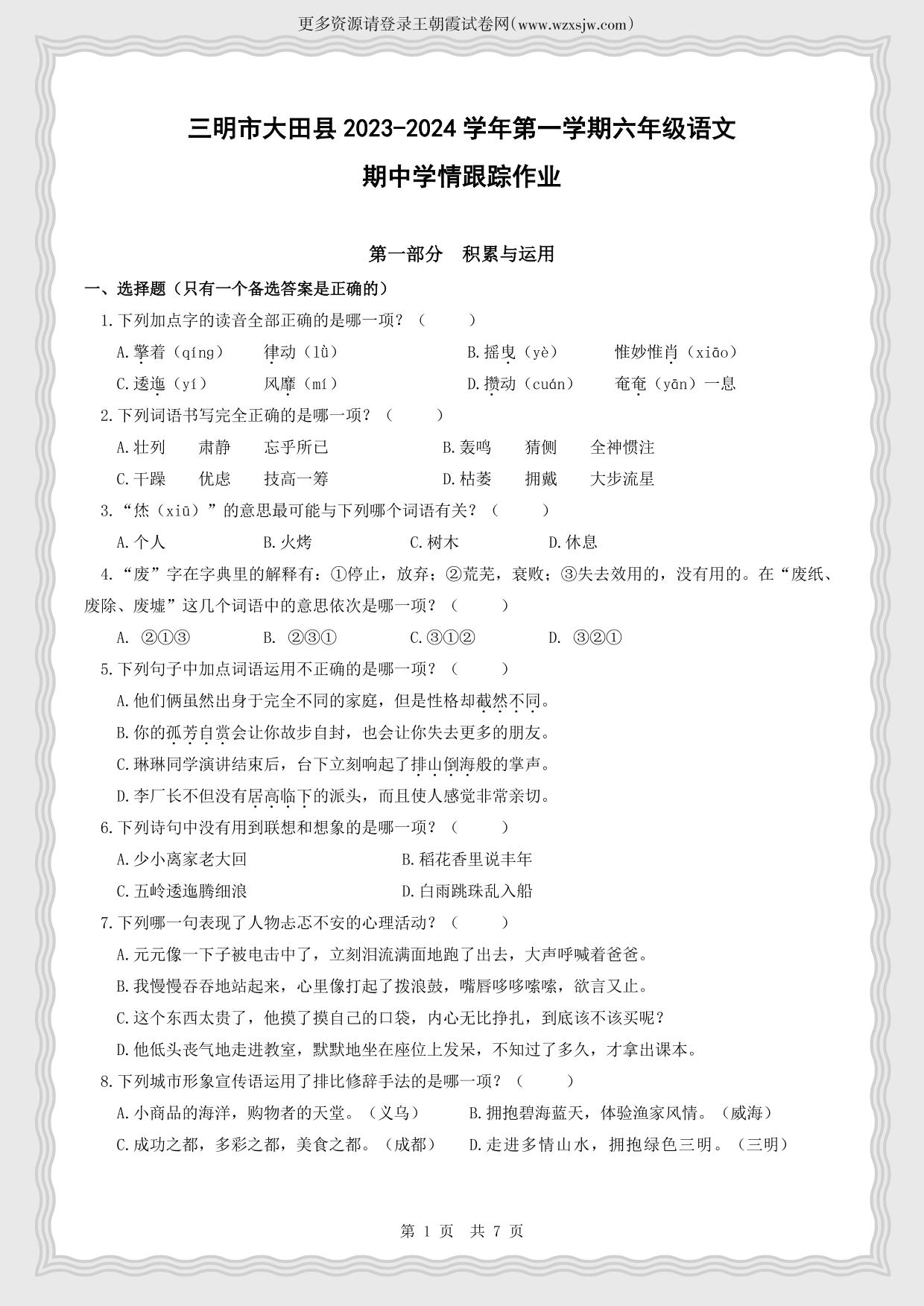 福建省三明市大田县2023-2024学年第一学期期中学情跟踪作业六年级语文(人教版)