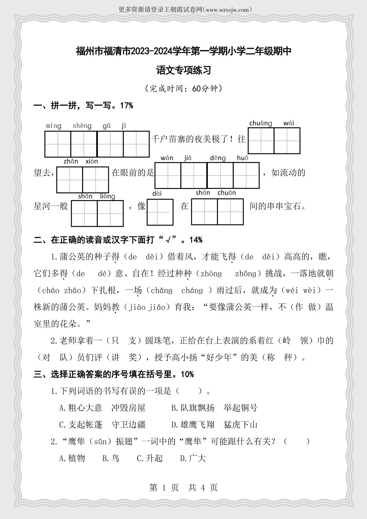 福建省福州市福清市2023-2024学年第一学期期中专项练习试题二年级语文(人教版)