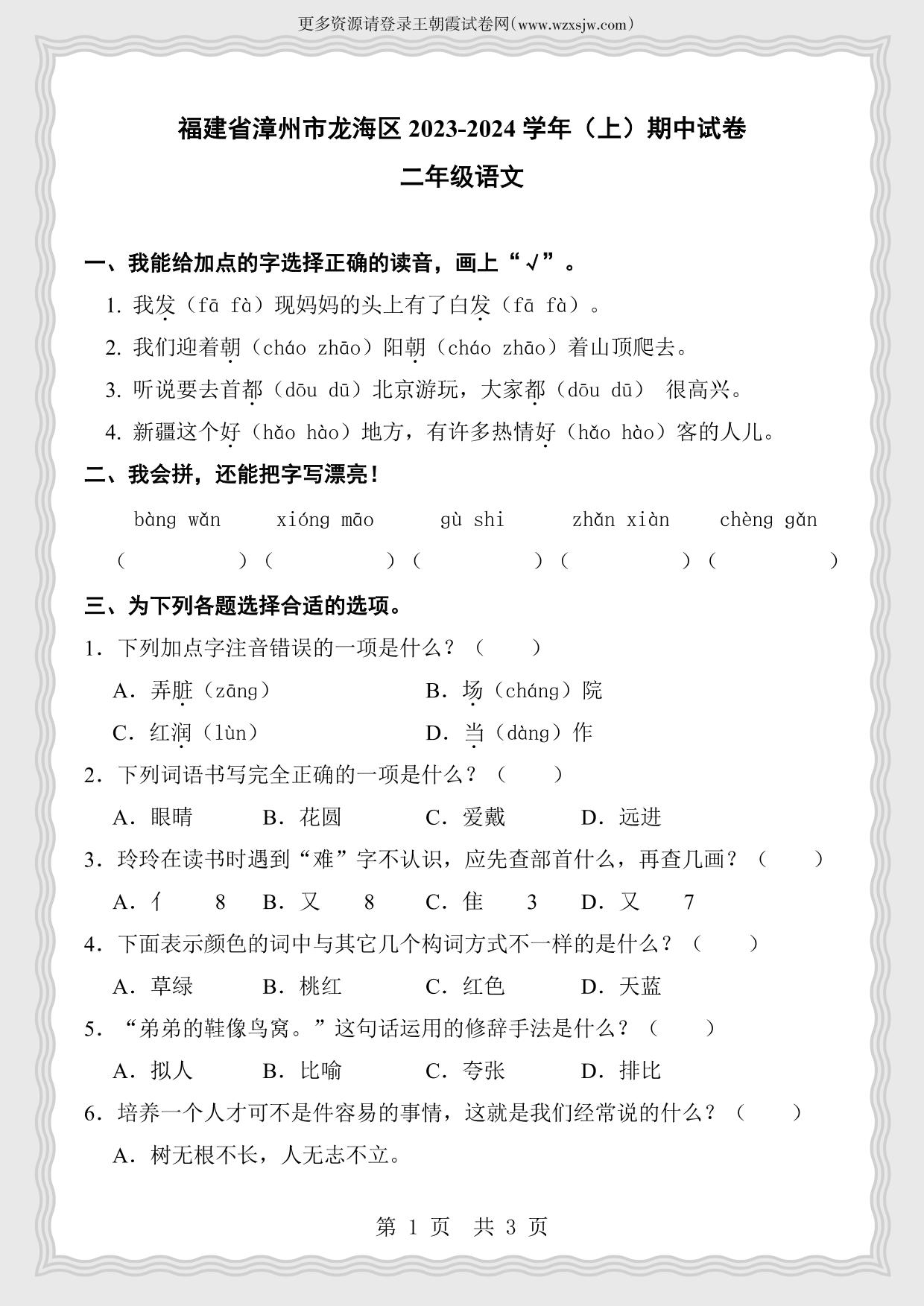 福建省漳州市龙海区2023-2024学年第一学期期中试卷二年级语文(人教版)