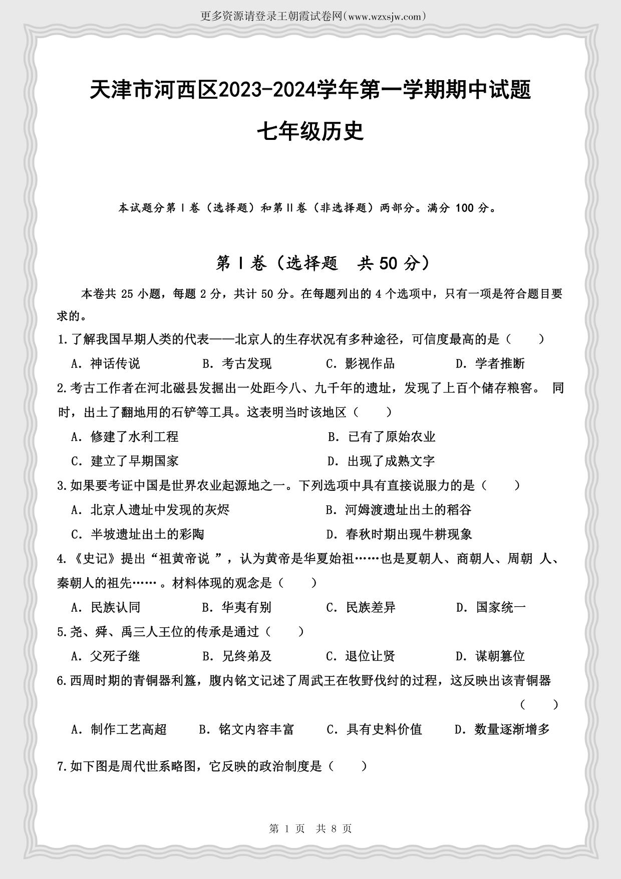 天津市河西区2023-2024学年第一学期期中试题七年级历史(人教版)