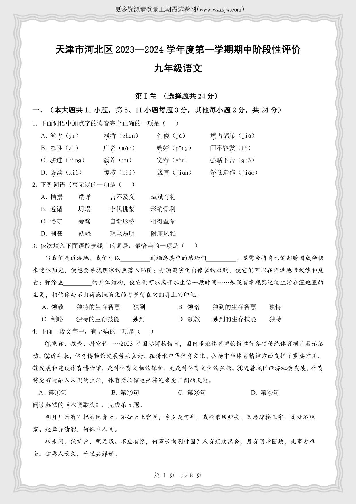 天津市河北区2023—2024学年度第一学期期中阶段性评价九年级语文(人教版)
