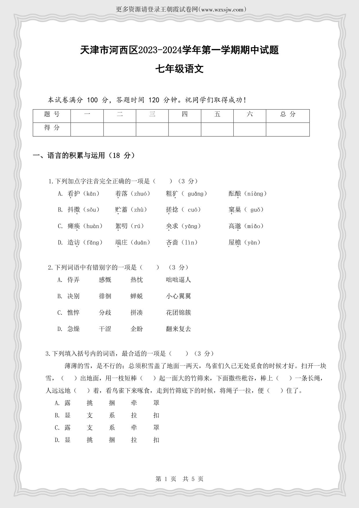 天津市河西区2023-2024学年第一学期期中试题七年级语文(人教版)