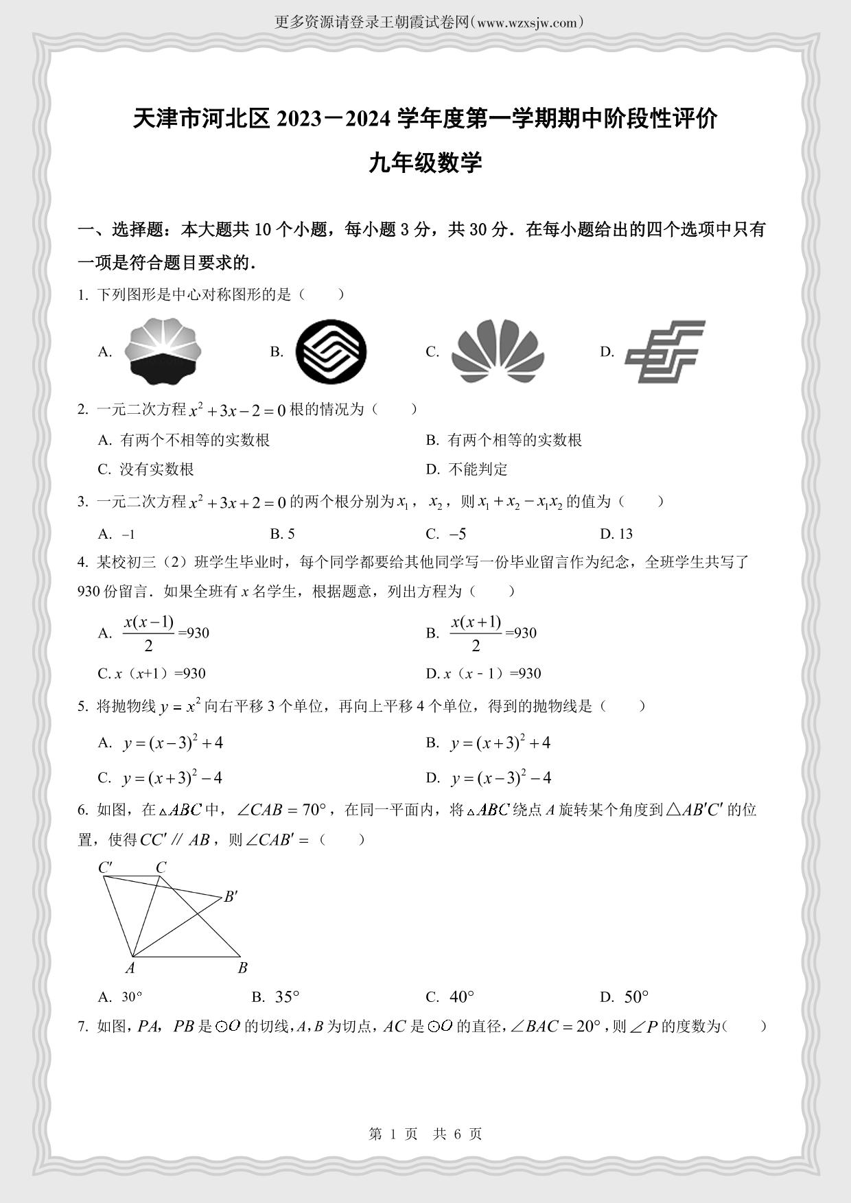 天津市河北区2023-2024学年度第一学期期中阶段性评价九年级数学(人教版)