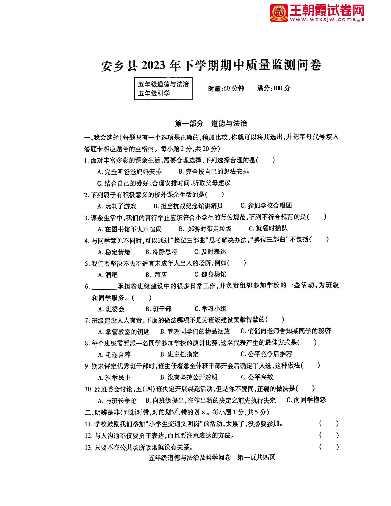 湖南省常德市安乡县2023-2024学年第一学期期中质量监测问卷五年级道德与法治(人教版)