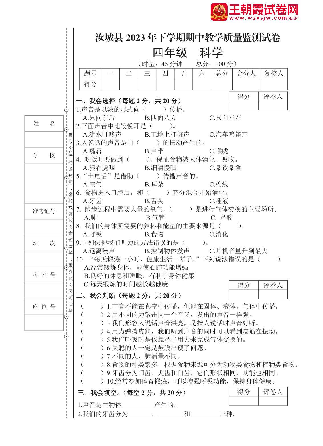 四年级科学教科版上册期中卷