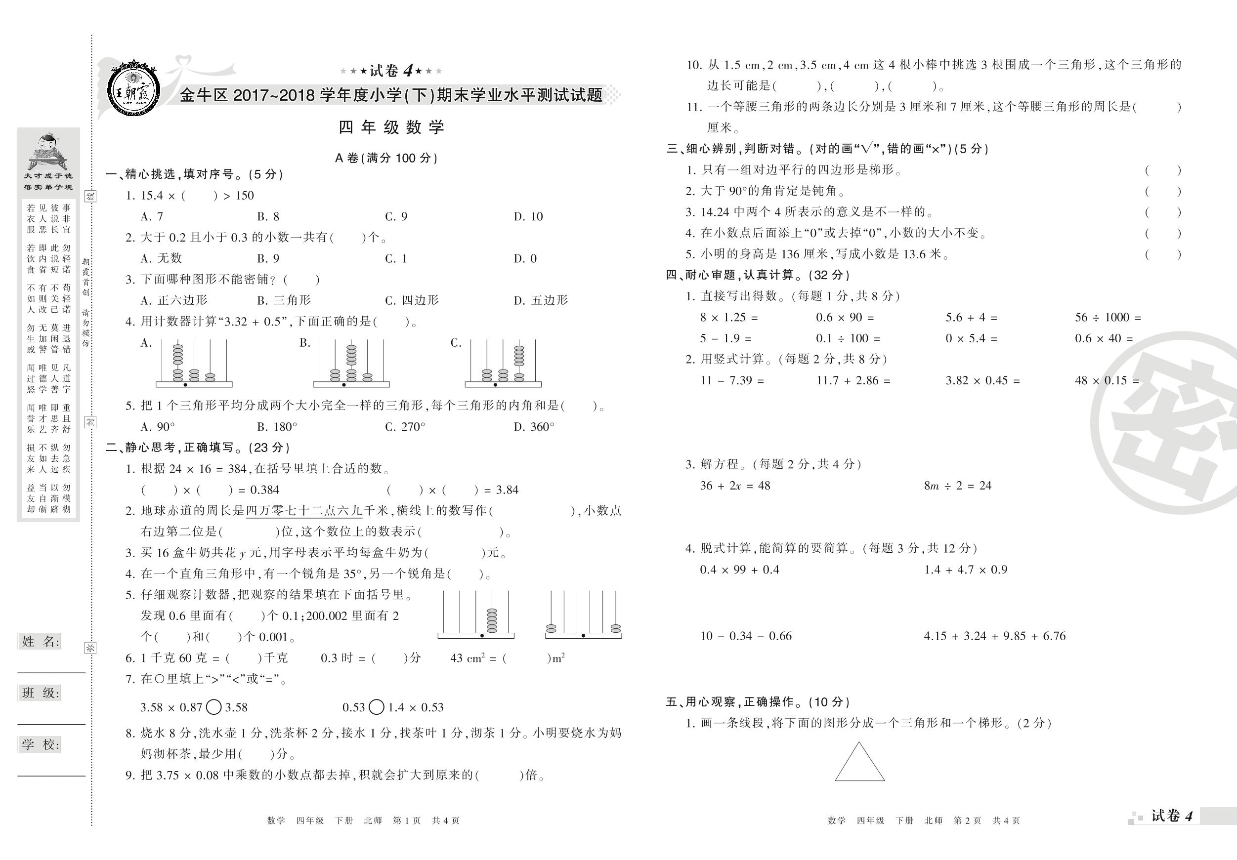 2017-2018学年第二学期成都市金牛区四年级数学试卷(北师版)【4】
