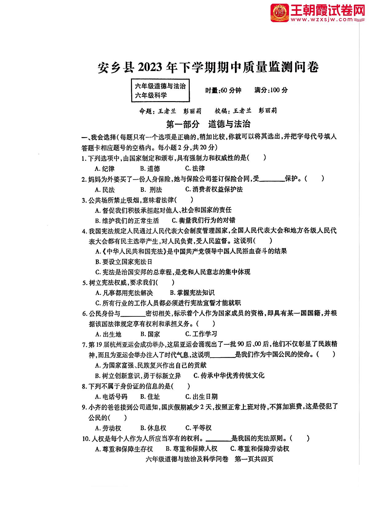 湖南省常德市安乡县2023-2024学年第一学期期中质量监测问卷六年级道德与法治(人教版)
