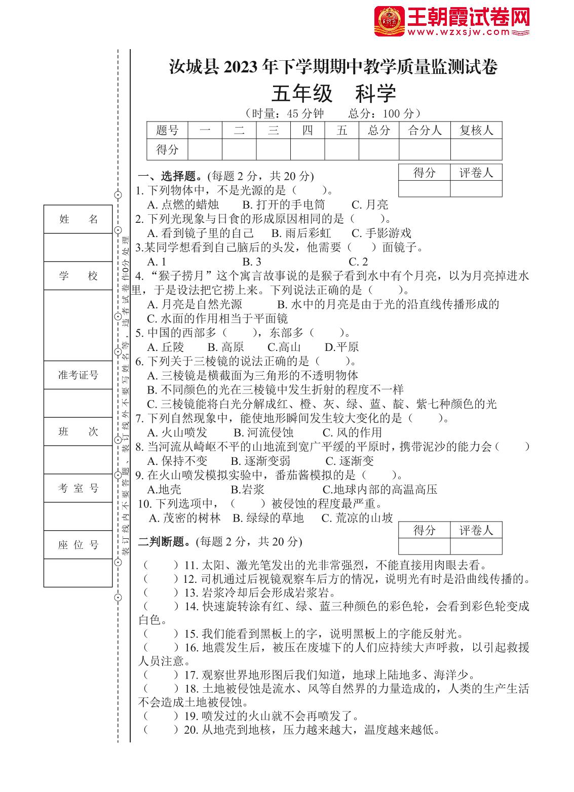 湖南省郴州市汝城县2023-2024学年第一学期期中教学质量监测试卷五年级科学(教科版)