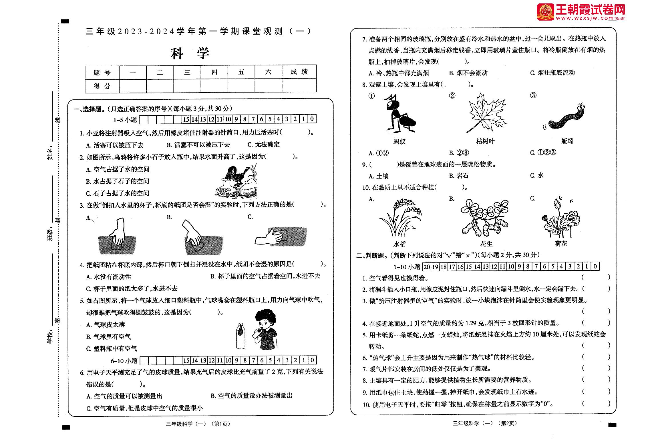 三年级科学人教鄂教版上册月考卷