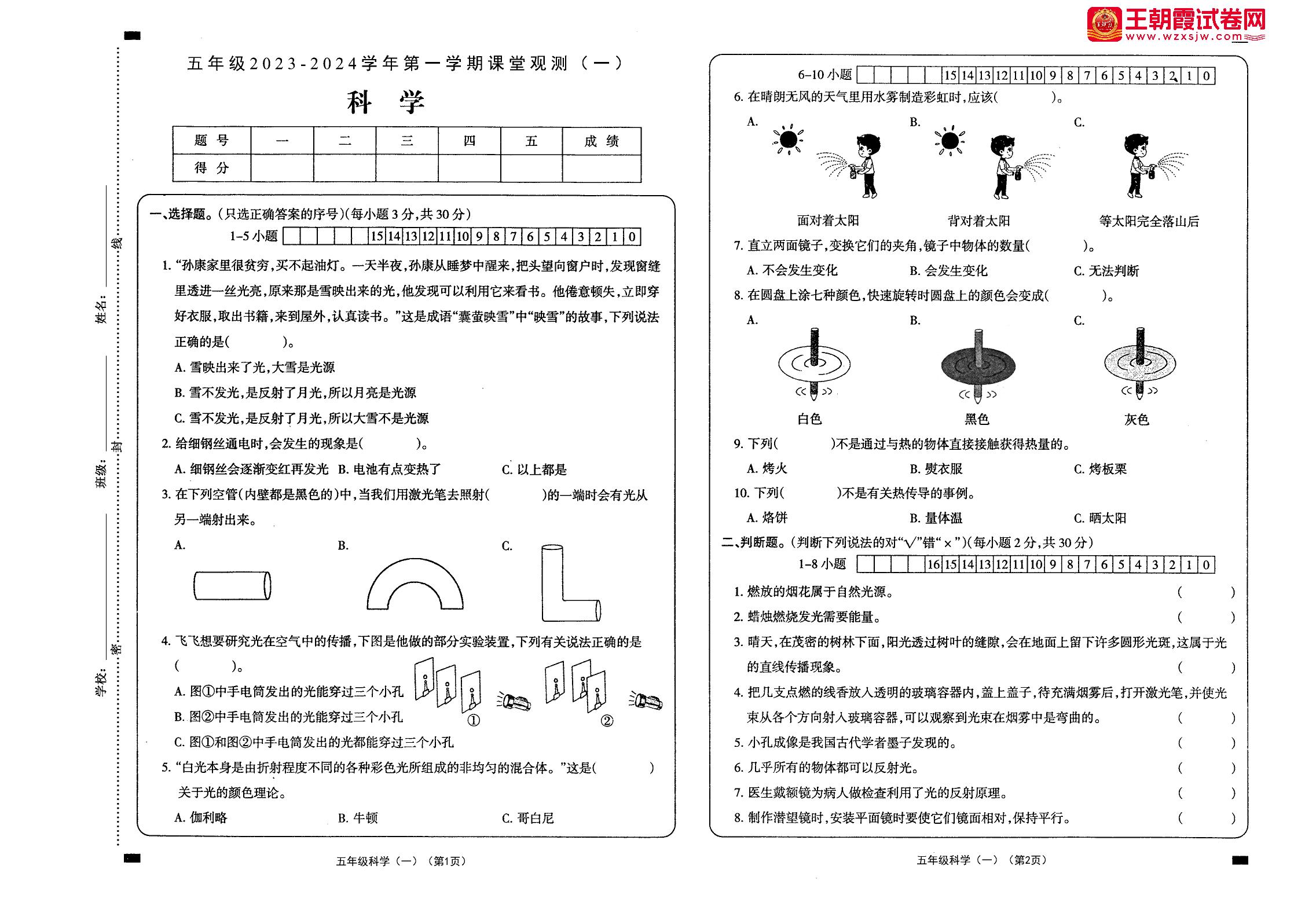 山西省大同市新荣区2023-2024学年第一学期课堂观测(月考)五年级科学(人教鄂教版)