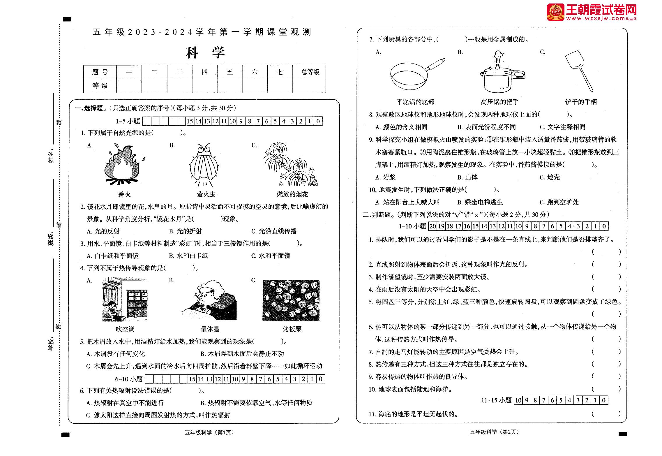 五年级科学冀人版上册期中卷