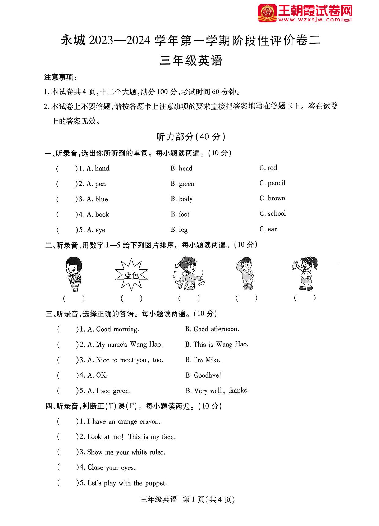 三年级英语人教PEP版(三起始)上册期中卷