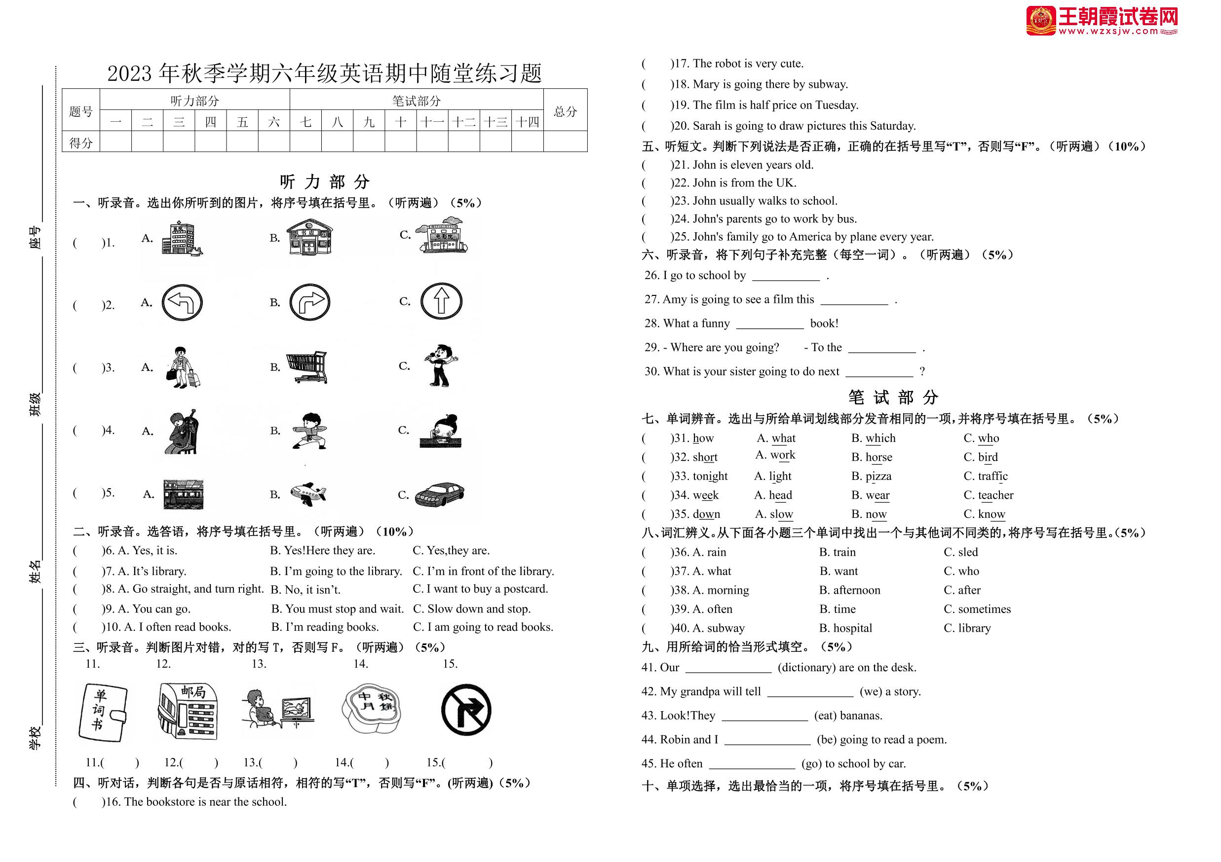 六年级英语人教PEP版(三起始)上册期中卷