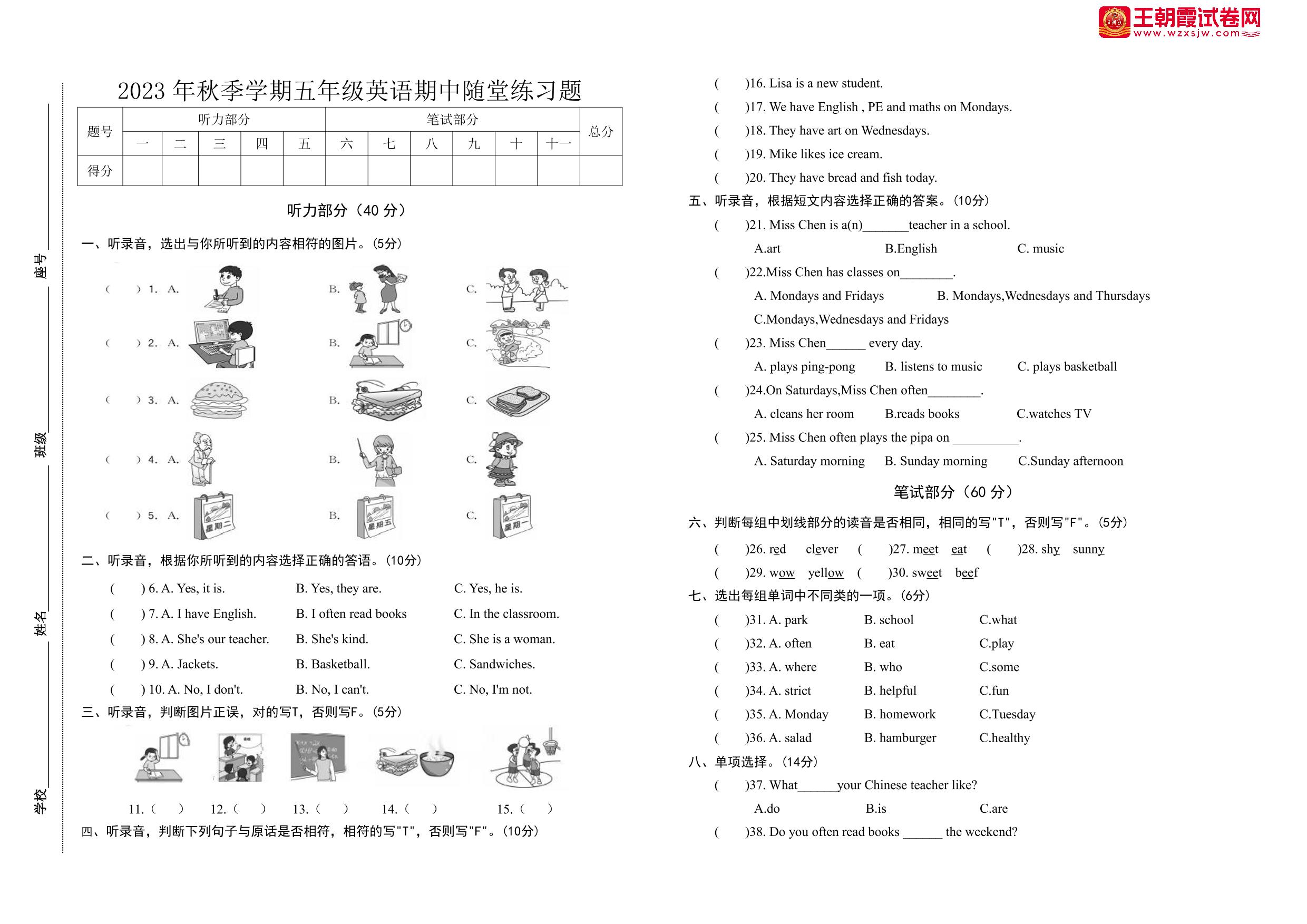 五年级英语人教PEP版(三起始)上册期中卷