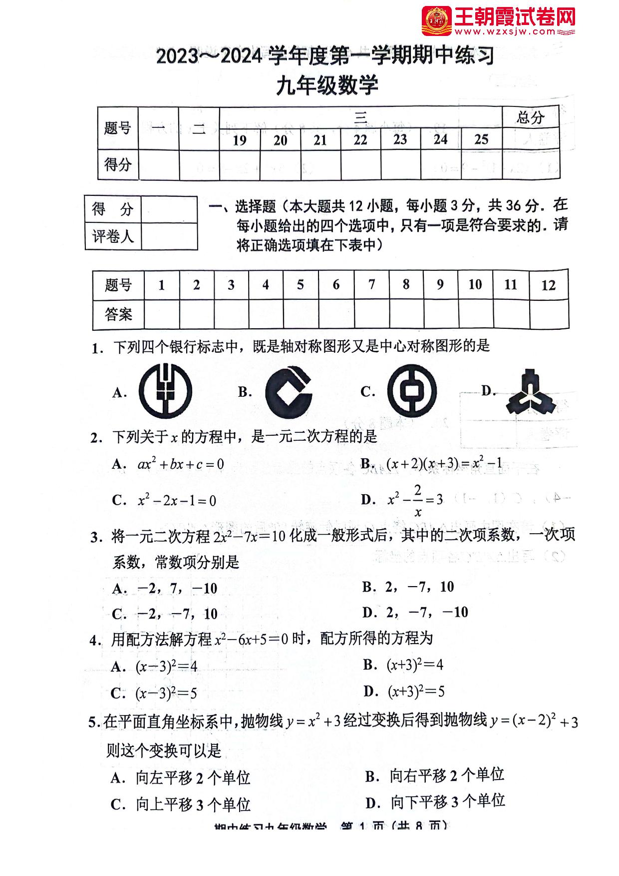 天津市部分区2023-2024学年第一学期期中练习九年级数学(人教版)