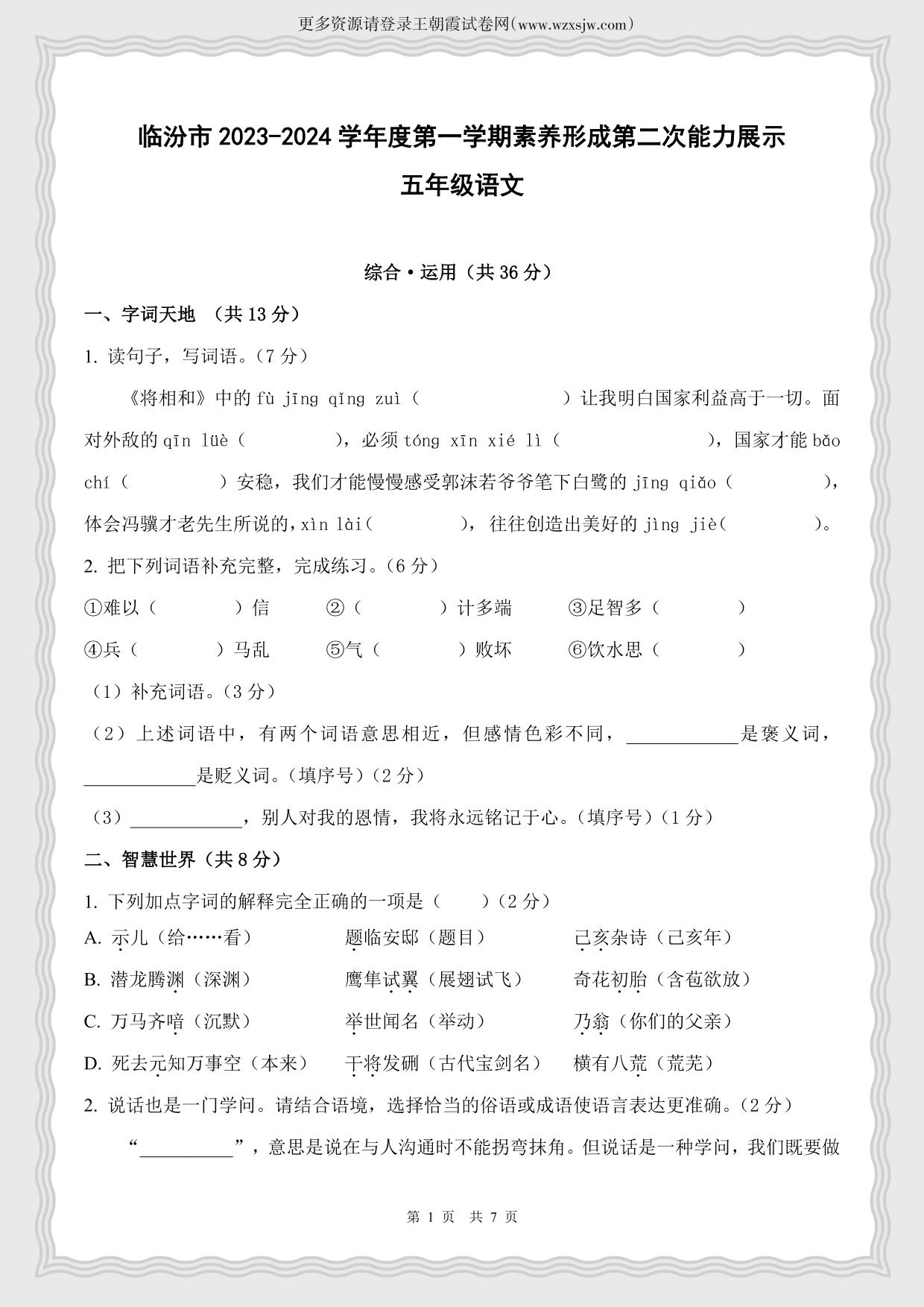 山西省临汾市2023-2024学年度第一学期期中素养形成第二次能力展示五年级语文(人教版)