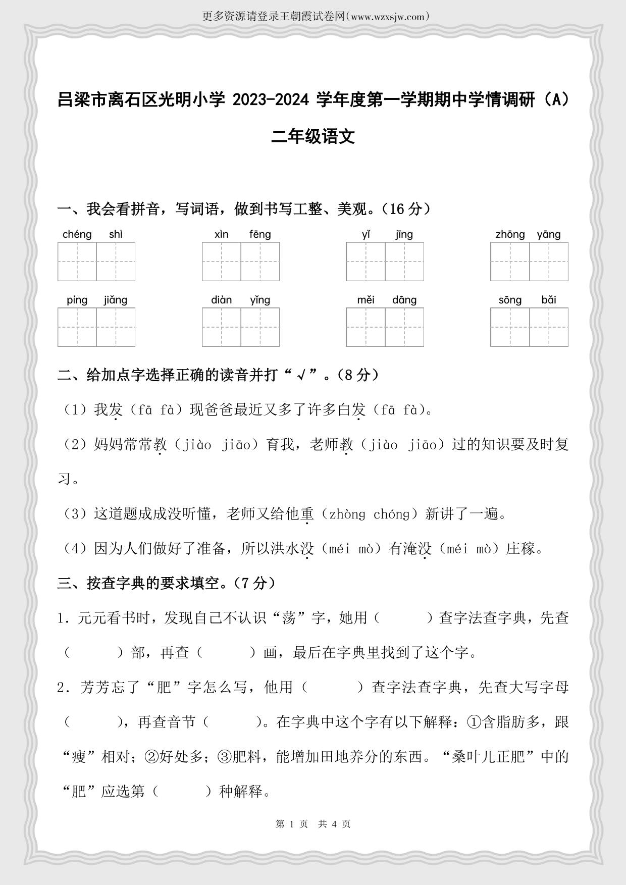山西省吕梁市离石区光明小学2023-2024学年度第一学期期中学情调研二年级语文(人教版)