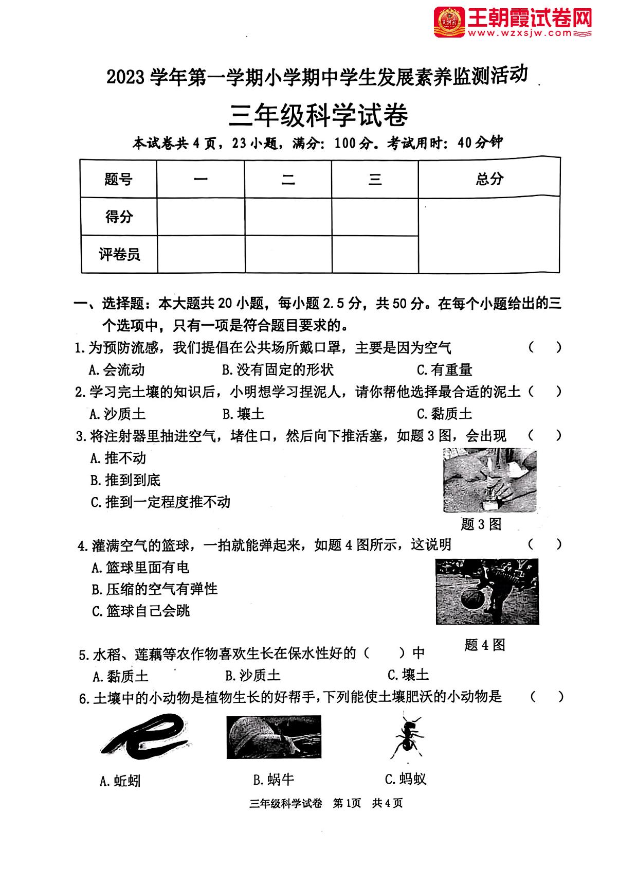 广东省清远市英德市2023-2024学年第一学期小学期中学生发展素养监测活动试卷三年级科学(苏教版)